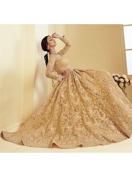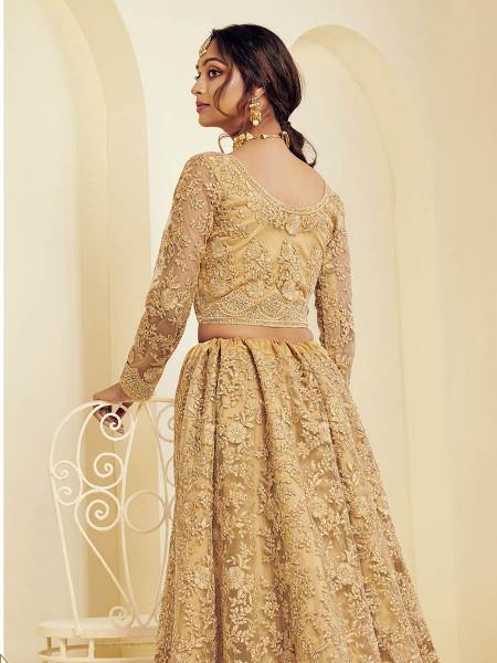 Golden Heavy Embroidered Net bridal Lehenga features a net with satin 2 layer with heavy quality can-can lehenga . embroidery is completed with cording. This Style is made in India and checked by hand to ensure high quality.