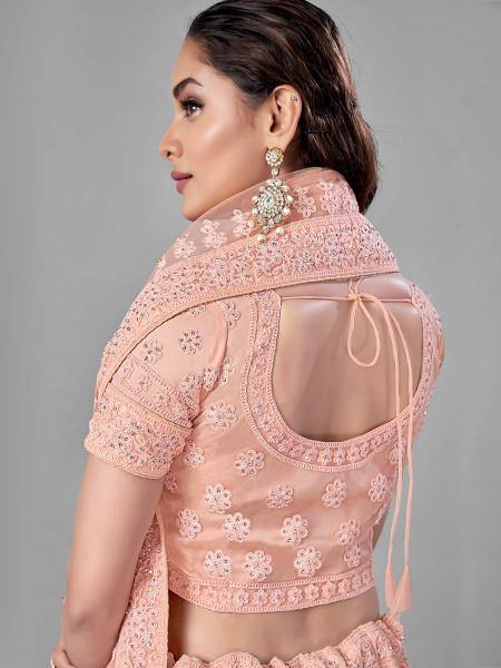 Peach Heavy Embroidered Soft Net bridal Lehenga features a Soft net with satin 2 layer with heavy quality can-can lehenga . embroidery is completed with Dori & Zarkan. This Style is made in India and checked by hand to ensure high quality.