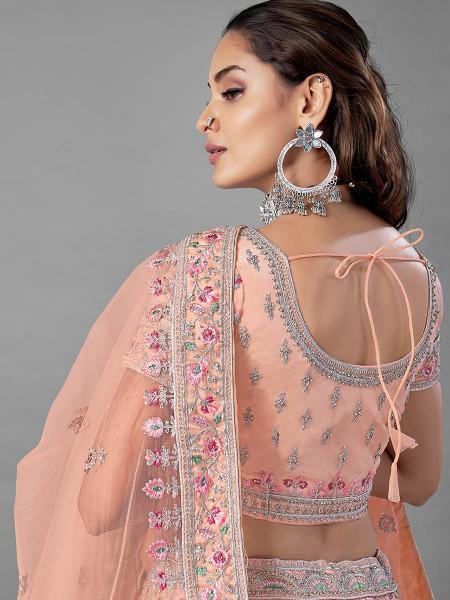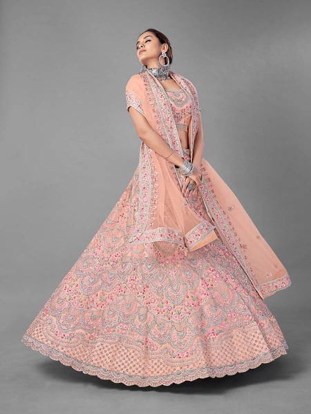 Peach Heavy Embroidered Soft Net bridal Lehenga features a Soft net with satin 2 layer with heavy quality can-can lehenga . embroidery is completed with Dori, Thread & Zarkan. This Style is made in India and checked by hand to ensure high quality.