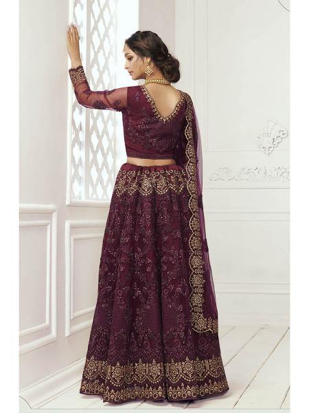 Wine Heavy Embroidered Net bridal Lehenga features a net with satin 2 layer with heavy quality can-can lehenga . embroidery is completed with Zari, Thread, Dori and Stone. This Style is made in India and checked by hand to ensure high quality.