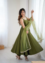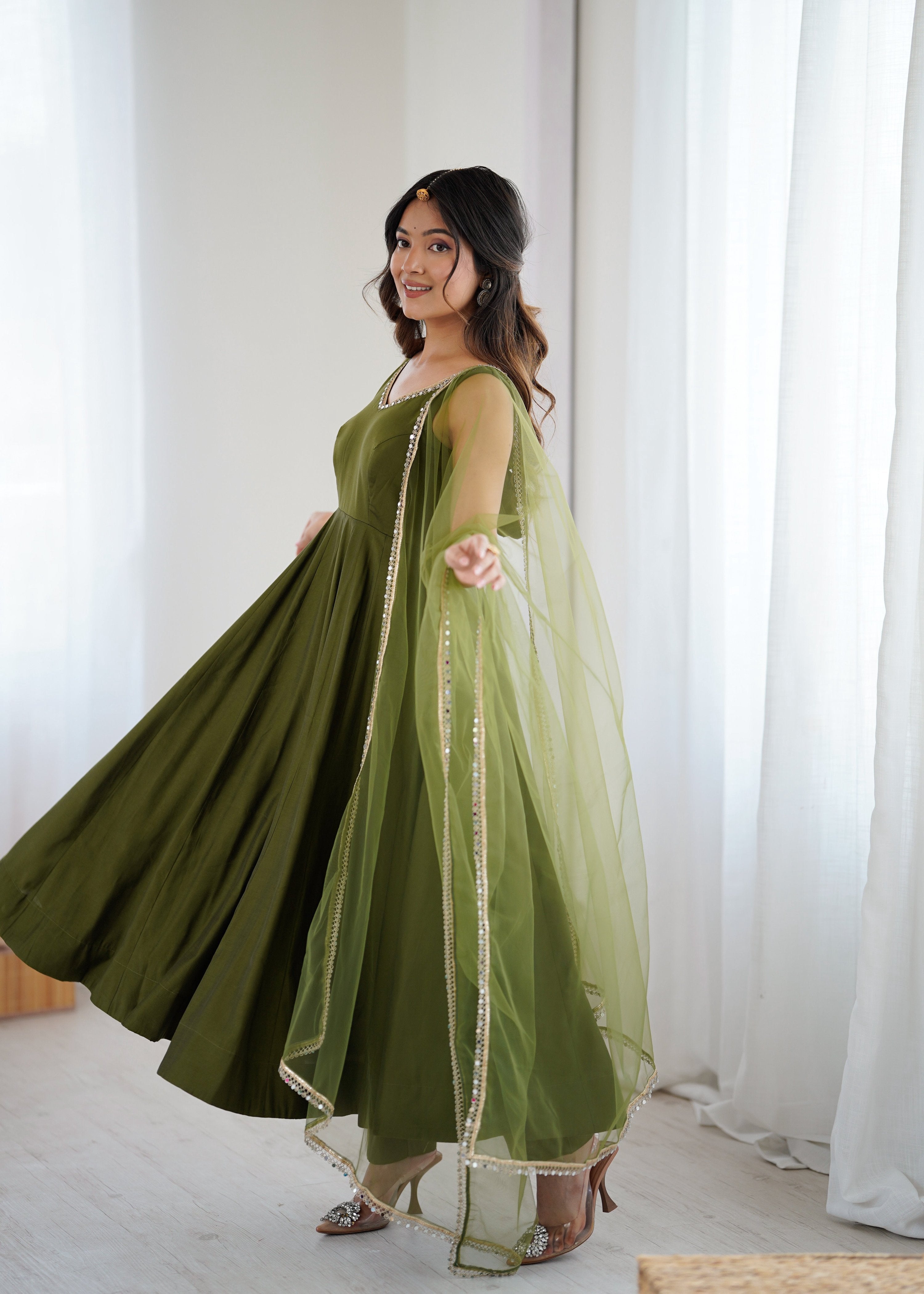 Lorenvalley Fashion Green Pure Romansilk Chanderi Fabric Yoke Fancy Lace Work Anarkali Kurta Pant With Dupatta Set - XS (34")