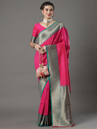 Mitera Women Pink & Blue Woven Design Zari Silk Blend Paithani Saree
