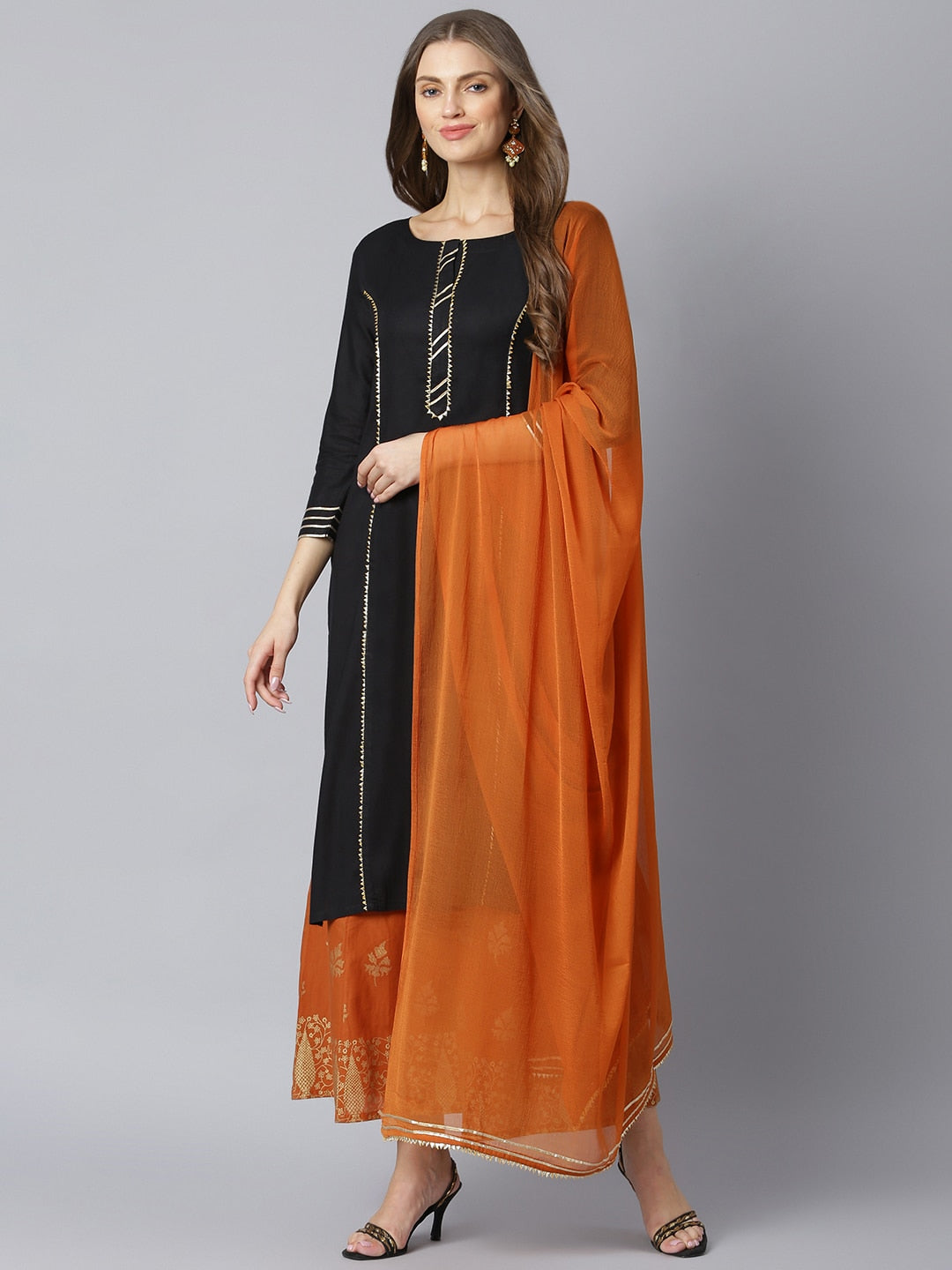 Black woven design kurta with palazzos and dupatta