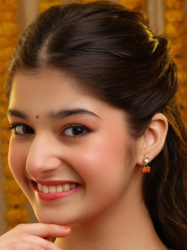 Orange-toned drop stud earrings can feature materials such as gold plating, brass, or resin with kundan work or gemstone details.These are drop or dangle style stud earrings, featuring movement below the earlobe.The design incorporates a small white pearl or bead accent at the top attachment point, with a post-and-back closure securing it to the earlobe. The main orange component has a polished finish.Legal Disclaimer : Product color may slightly vary due to photographic lighting sources or your monitor settings.