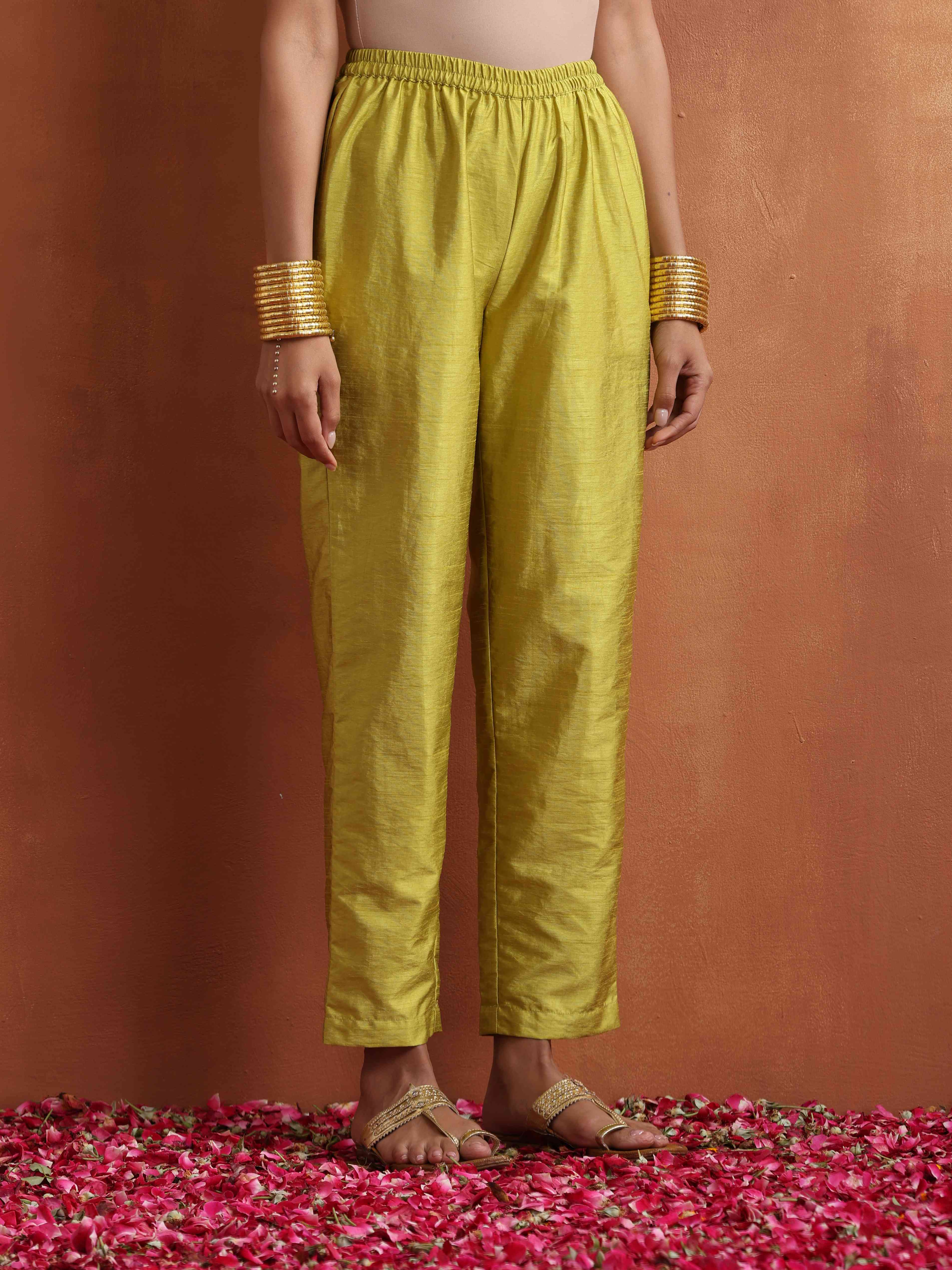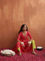 • Elevate your style with this hot pink tissue flared anarkali kurta paired perfectly with green silk blend elasticated waist pants