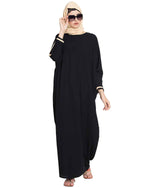 Bashariya Elegant Kaftan Abaya In Free Size With Contrast Detailings-BlackVery simple yet very elegant kaftan Abaya with a running pipe of compleme...