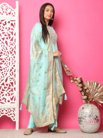 Jyoti Fashion Women's Turquoise Silk Jacquard Woven with Hand Work Salwar Suit Set - XS