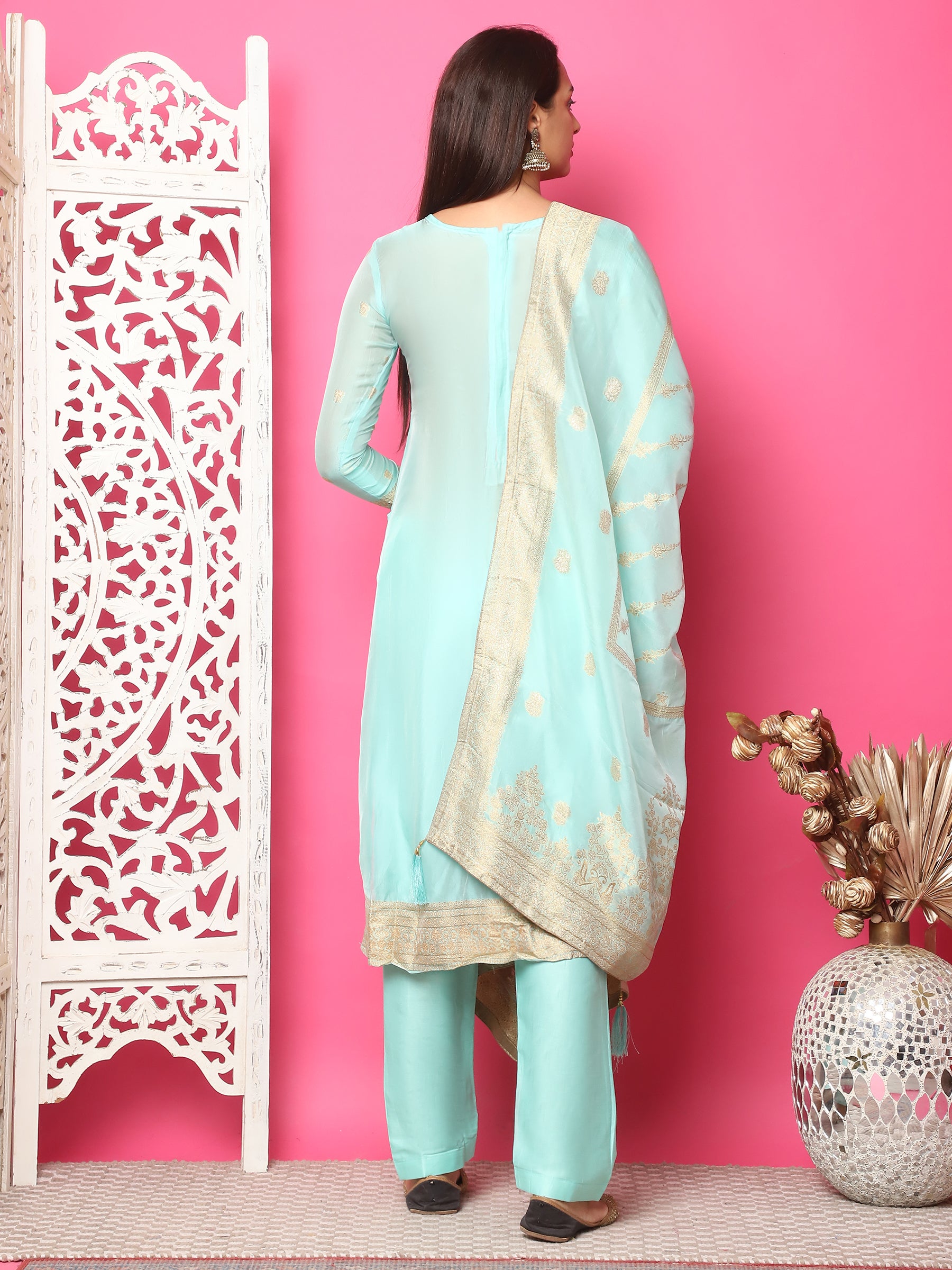 Jyoti Fashion Women's Turquoise Silk Jacquard Woven with Hand Work Salwar Suit Set