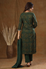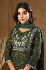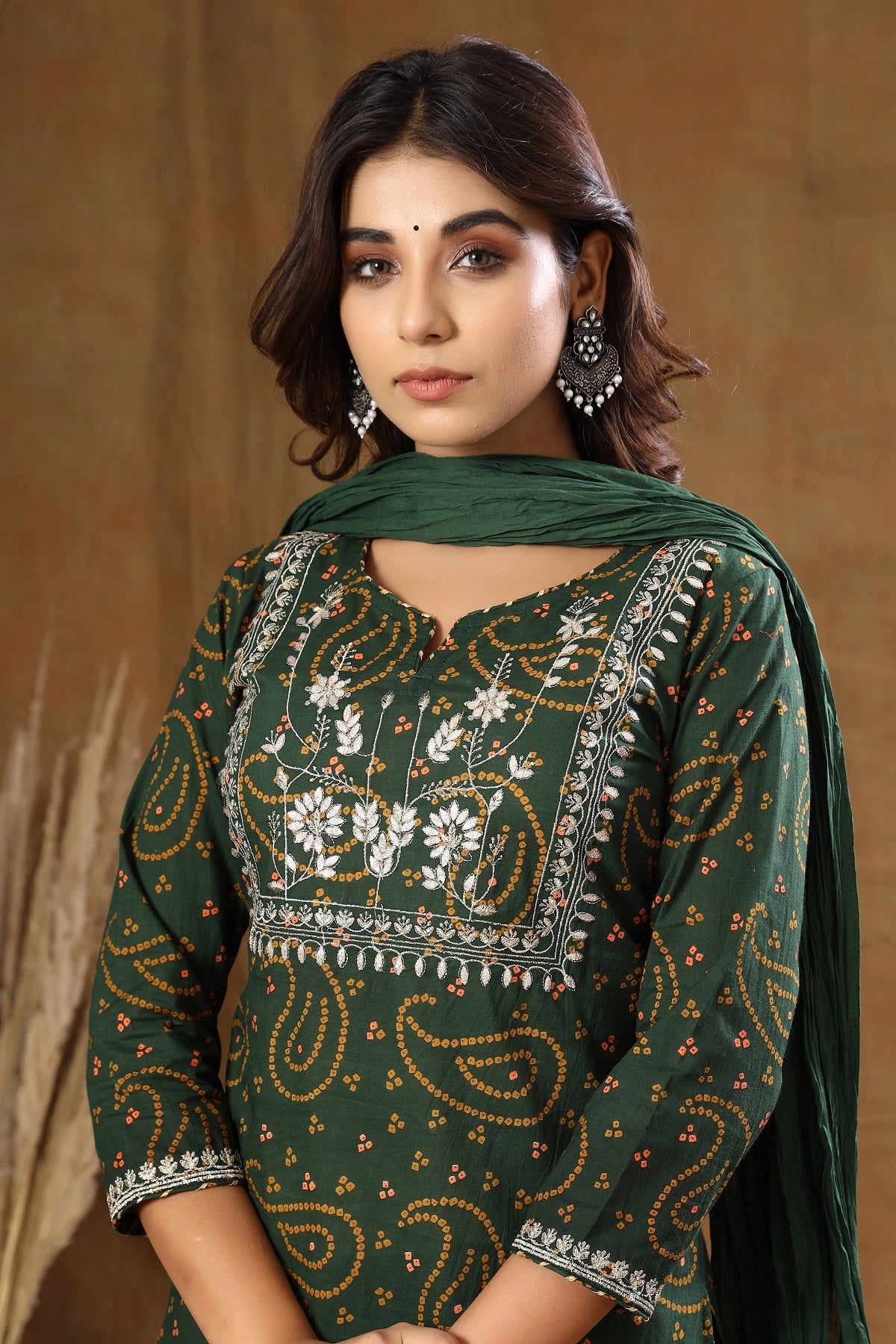 Green Bandhej Embroidery Suit Set By KAAJH. It Has Elegant Gotta Embroidery Work On The Neck Line Which Makes This Kurta Set Classy And Luxurious. You Can Choose This Kurta Set For Your Casual Gatherings And Events. KAAJH's collection makes it easy for you to transition from an everyday look into the look of royalty without effort and with just one outfit yet trendy and affordable for every woman.
