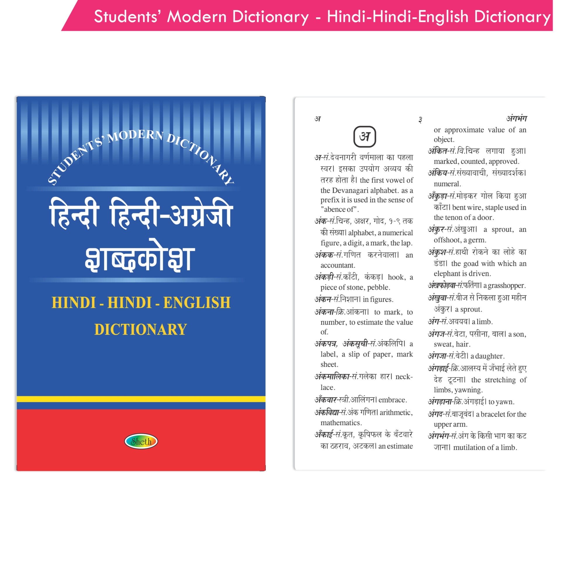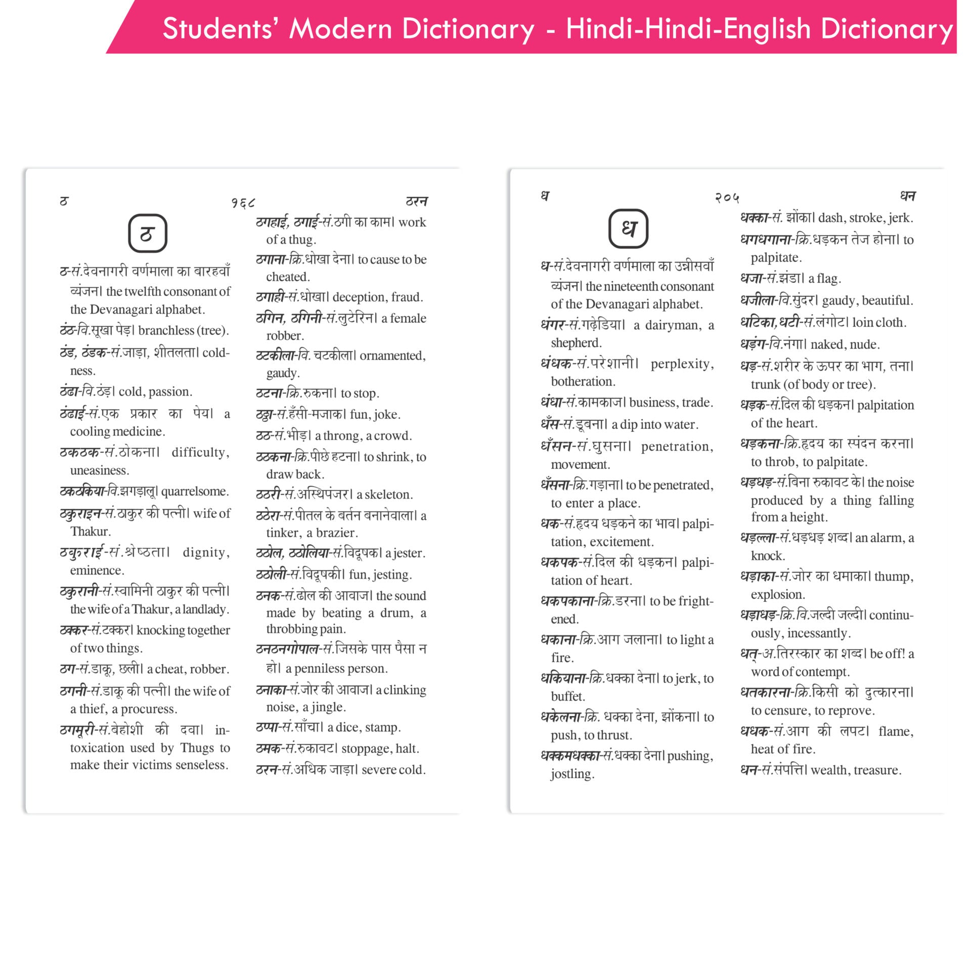 • Students Modern Dictionary provides you with simple translation for Hindi words in both Hindi and English which will help you understand and strengthen your vocabulary.The book is a very reliable source and a lifelong guide for the readers
