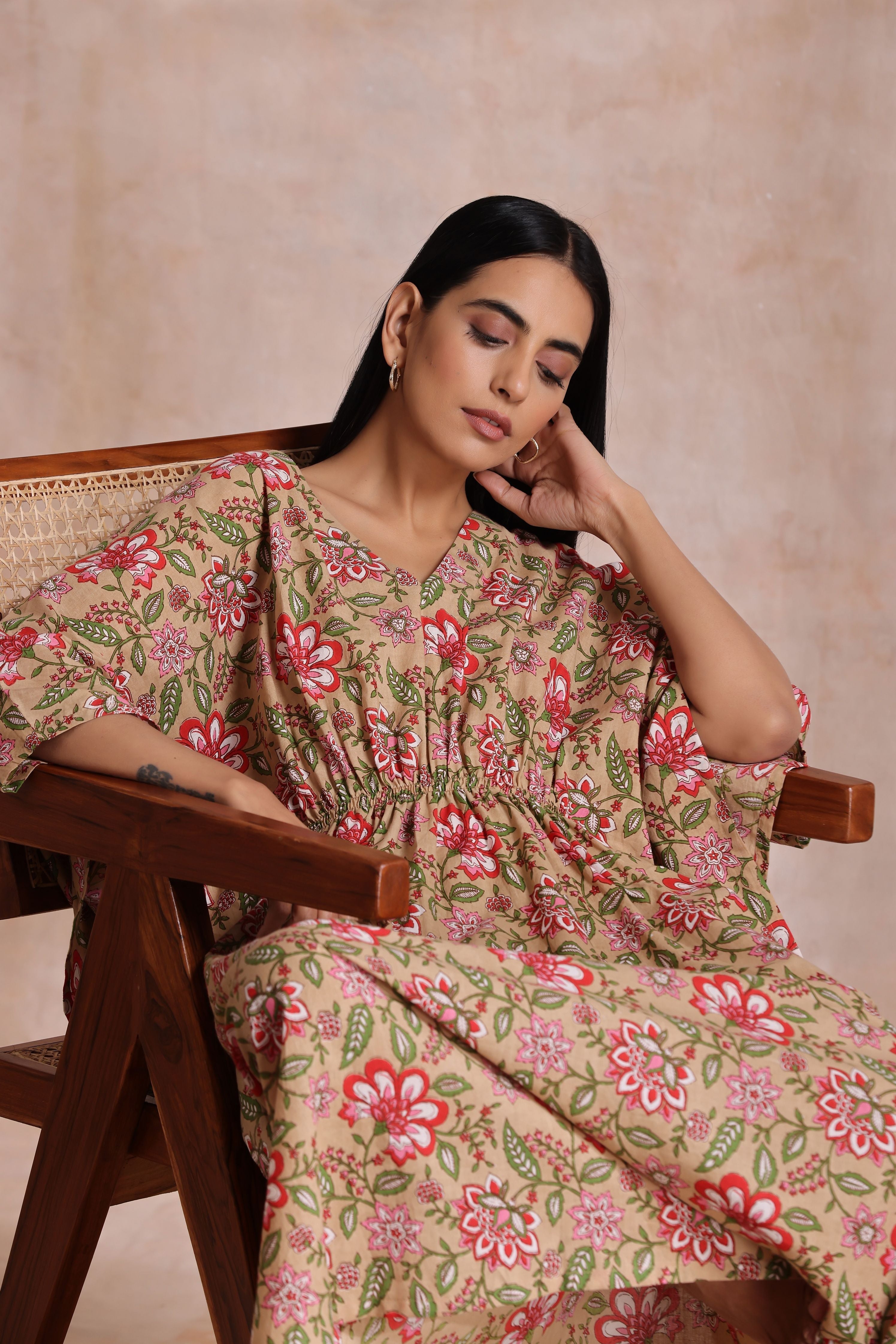trueBrowns Beige Overall Big Floral Block Print Cotton Kaftan Dress - Distacart