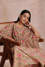 trueBrowns Beige Overall Big Floral Block Print Cotton Kaftan Dress