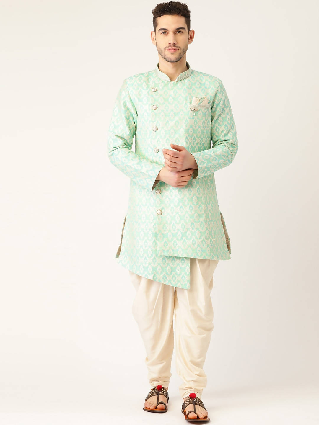 Manyavar Men Green & Off-White Jacquard Angrakha Kurta with Patiala - S