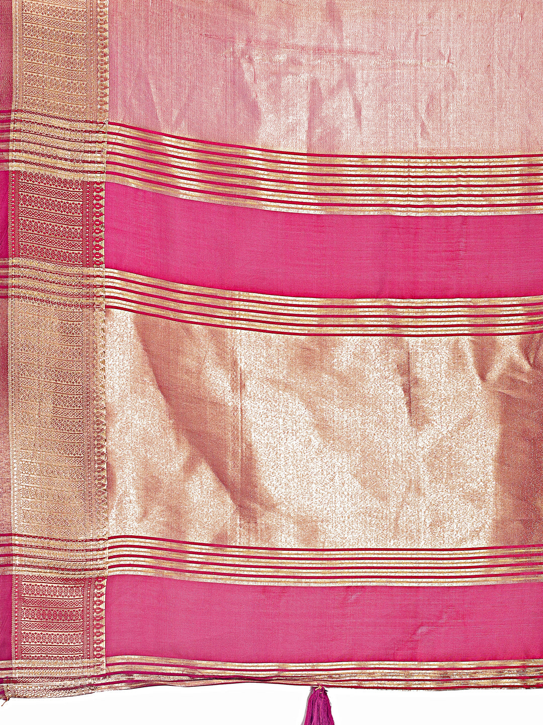This dual-shade Light Pink and Magenta organza saree exudes timeless elegance with its rich golden zari border and lustrous fabric. The soft transparency of organza is balanced by bold design accents, including a Magenta pallu adorned with statement tassels. Whether it’s for a festive celebration, wedding function, or party night, this saree delivers unmatched grace and comfort. Comes with a matching unstitched blouse piece for your perfect custom fit.