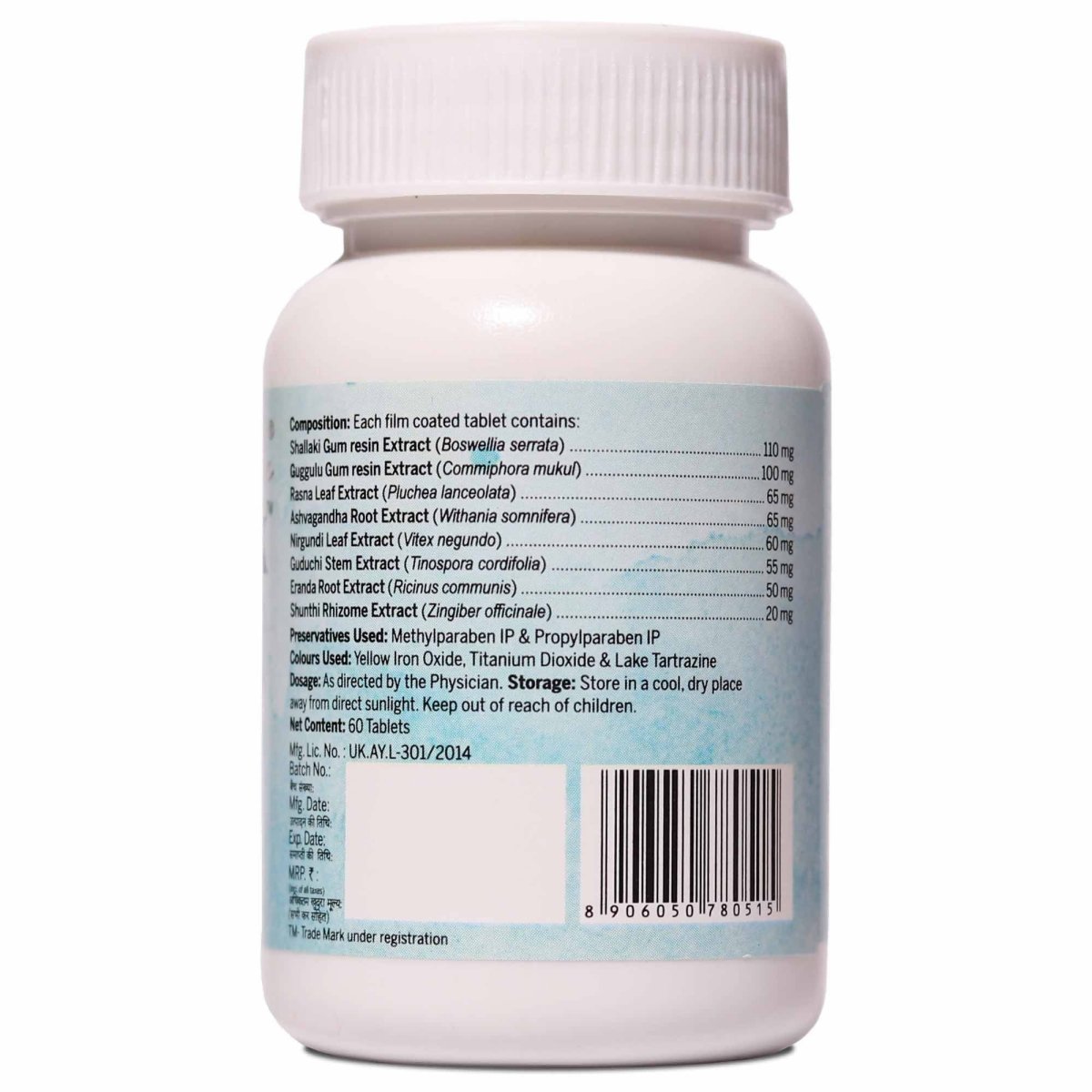 Ingredients: Shallaki Gum resin Extract, Guggulu Gum resin Extract, Rasna Leaf Extract, Ashvagandha Root Extract, Nirgundi Leaf Extract, Guduchi Stem Extract, Eranda Root Extract, Shunthi Rhizome Extract