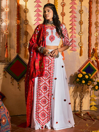 Myra White Art Silk Gamthi Work Designer Lehenga