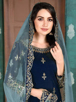 Navy Blue Art Silk Embroidered Patiyala Suit features a art silk kameez , net dupatta with santool bottom. embroidery is completed with thread , zari and stone. This style is made in India and checked by hand to ensure high quality.