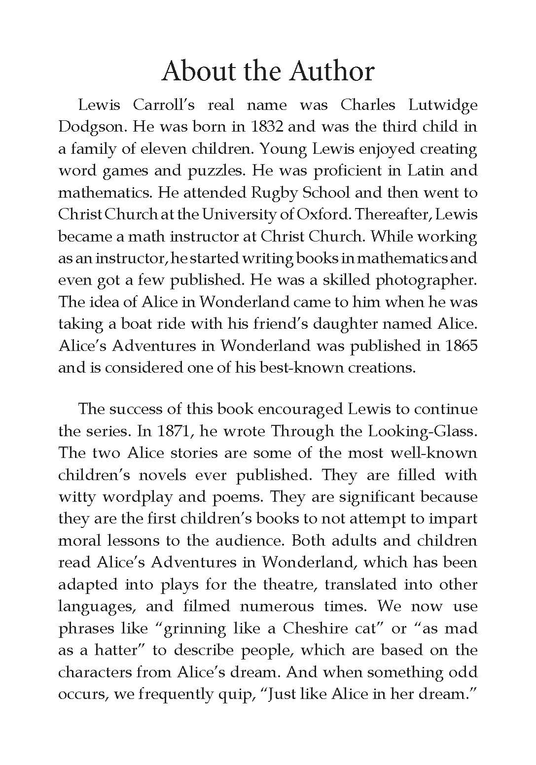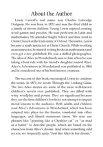Lewis Carroll's Alice in Wonderland is a beloved children's novel that tell the story of a young girl named Alice who falls into a magical world through a rabbit hole. Along the way, she meets a cast of eccentric characters who speak in cryptic and nonsensical language. As Alice navigates this strange world, she finds herself caught up in a trial and struggles to make sense of the animal's odd behaviour. This story has captured the hearts of readers for generations and remains a classic in children's literature.