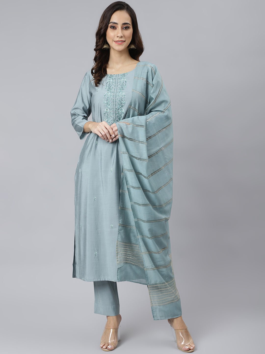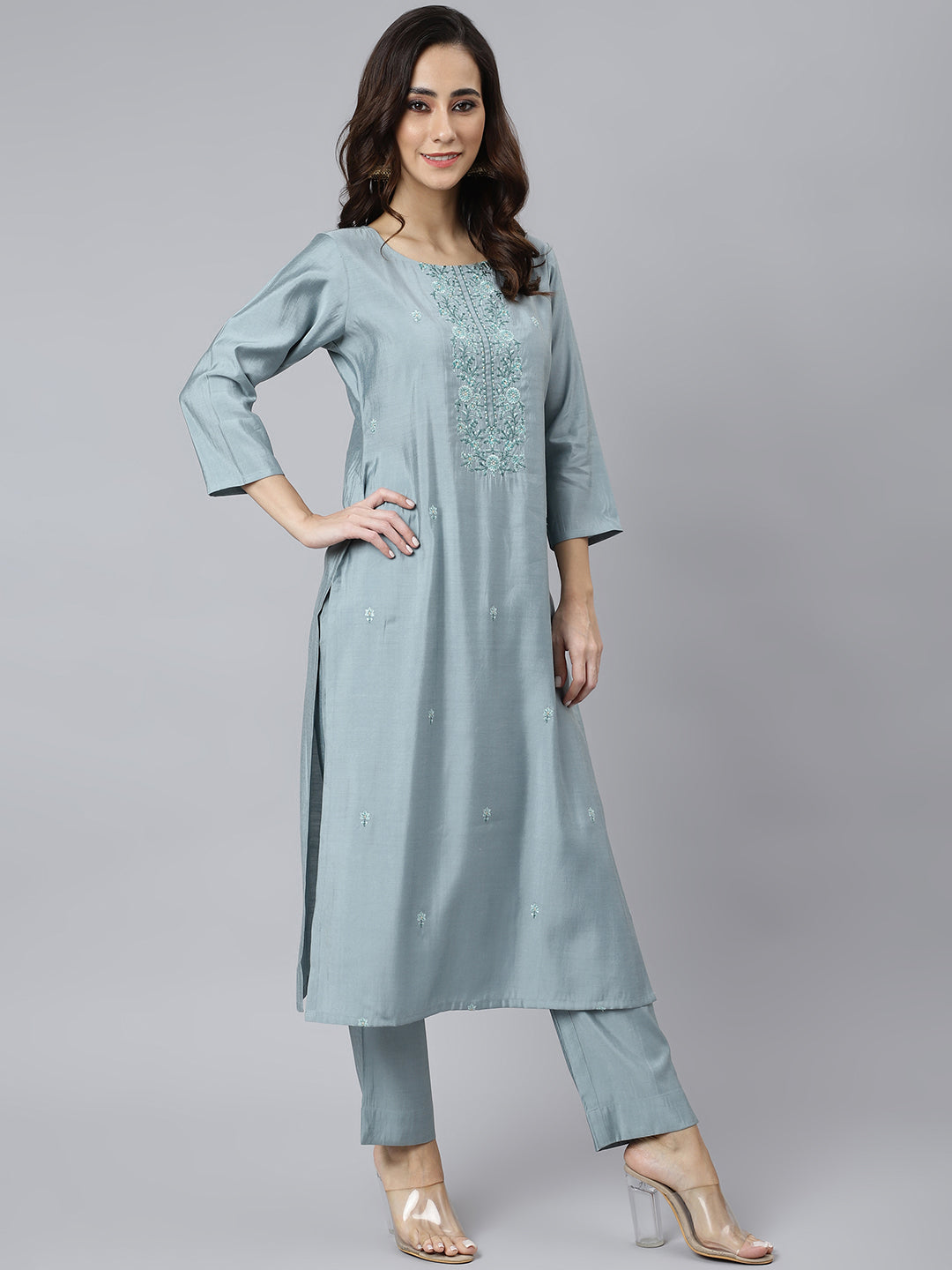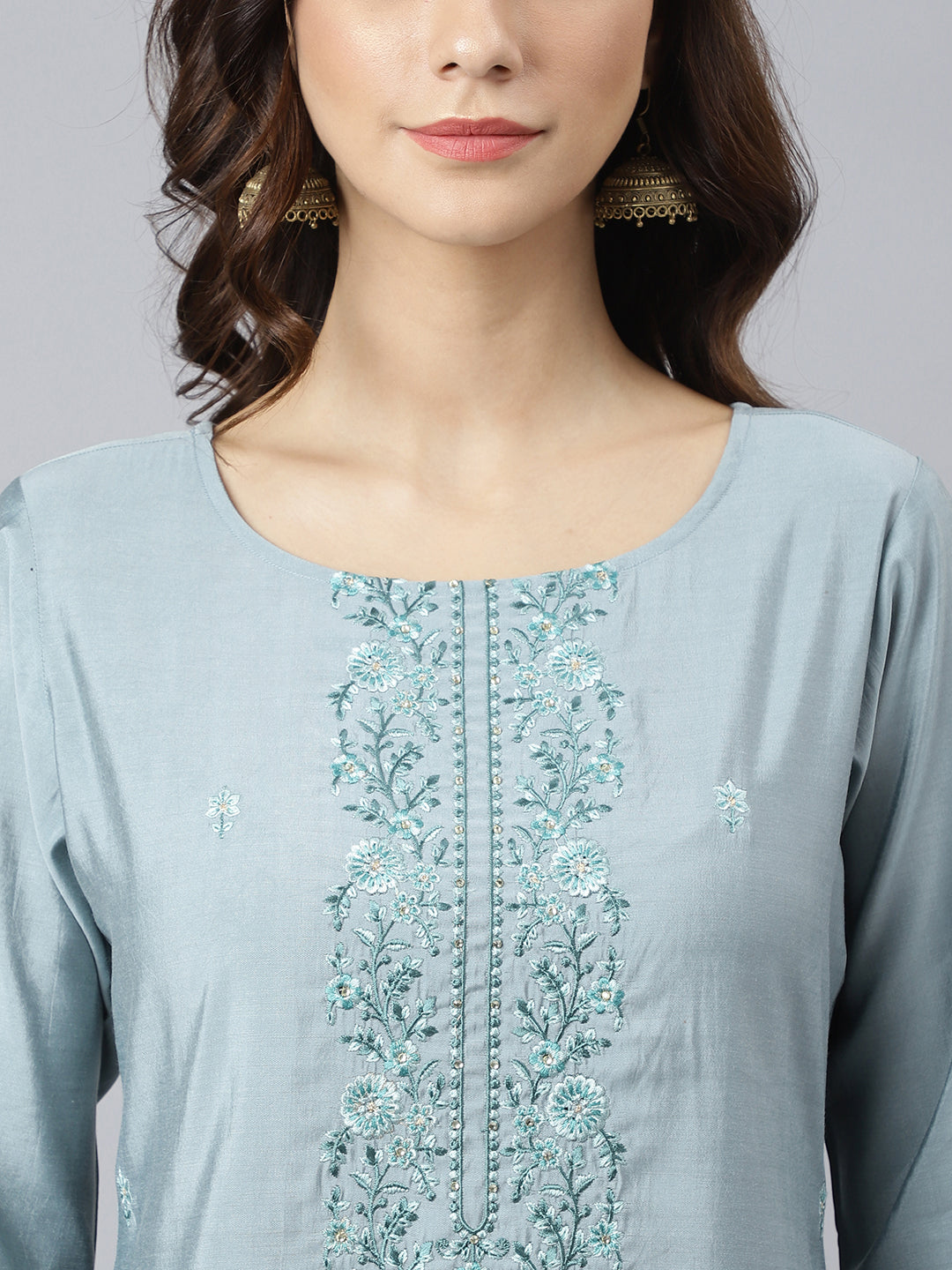 Amp up your fashion quotient with this dusty blue embroidered kurta set. The kurta is crafted in viscose blend fabric and comes with delicate embroidery, a round neck, and quarter sleeves and the pant is designed in the same fabric with straight cut silhouette. It is paired with silk dupatta that has an organza panel detailing.