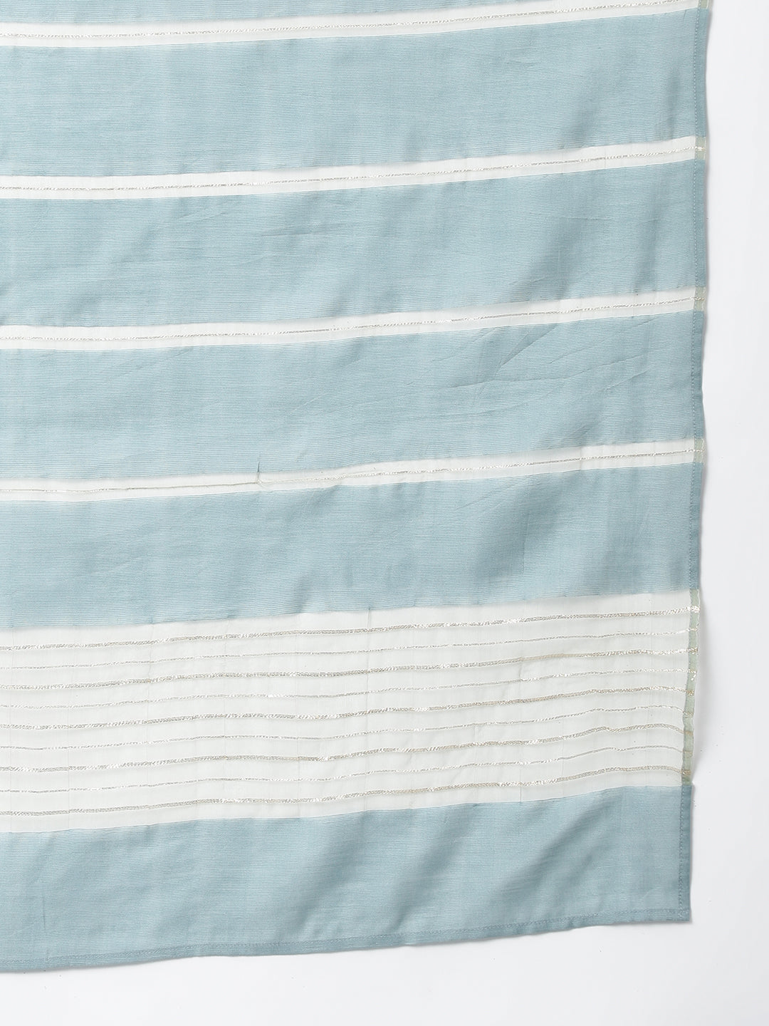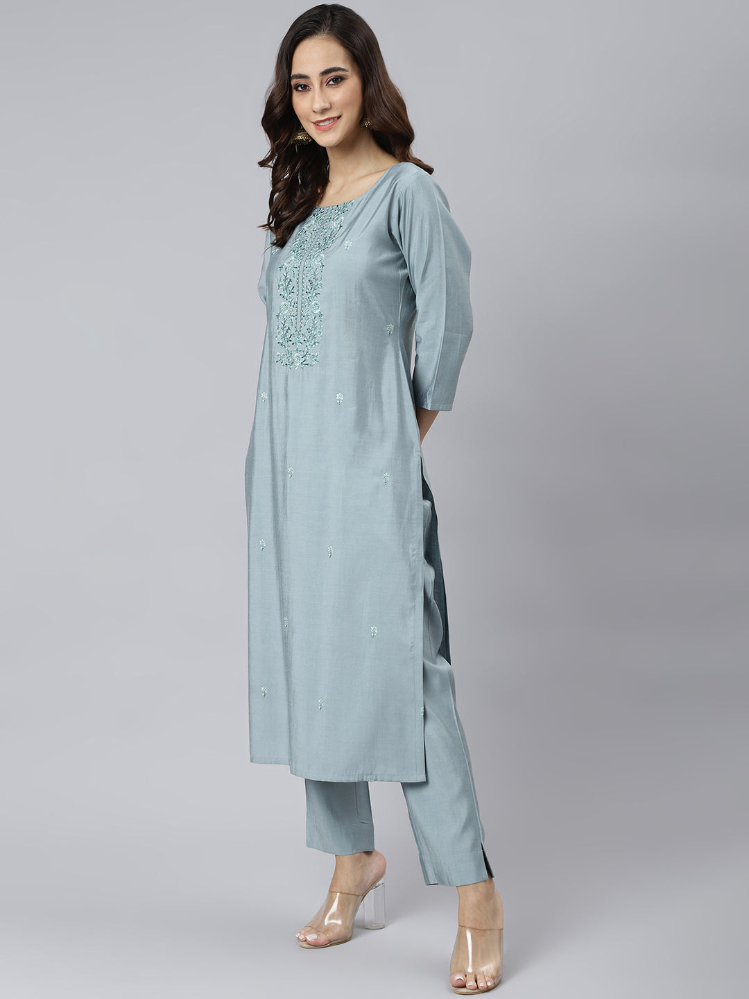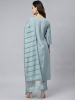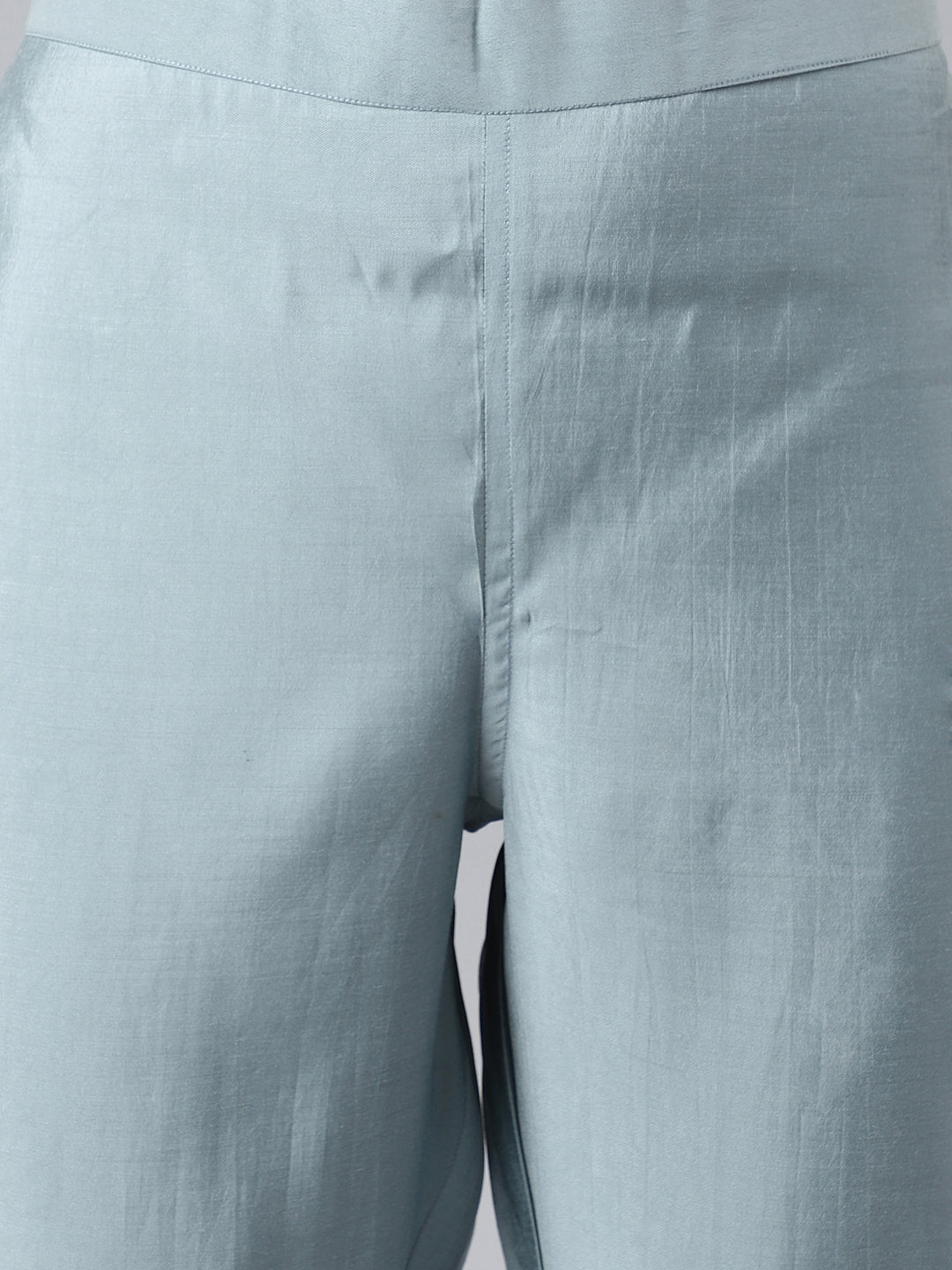 Amp up your fashion quotient with this dusty blue embroidered kurta set. The kurta is crafted in viscose blend fabric and comes with delicate embroidery, a round neck, and quarter sleeves and the pant is designed in the same fabric with straight cut silhouette. It is paired with silk dupatta that has an organza panel detailing.