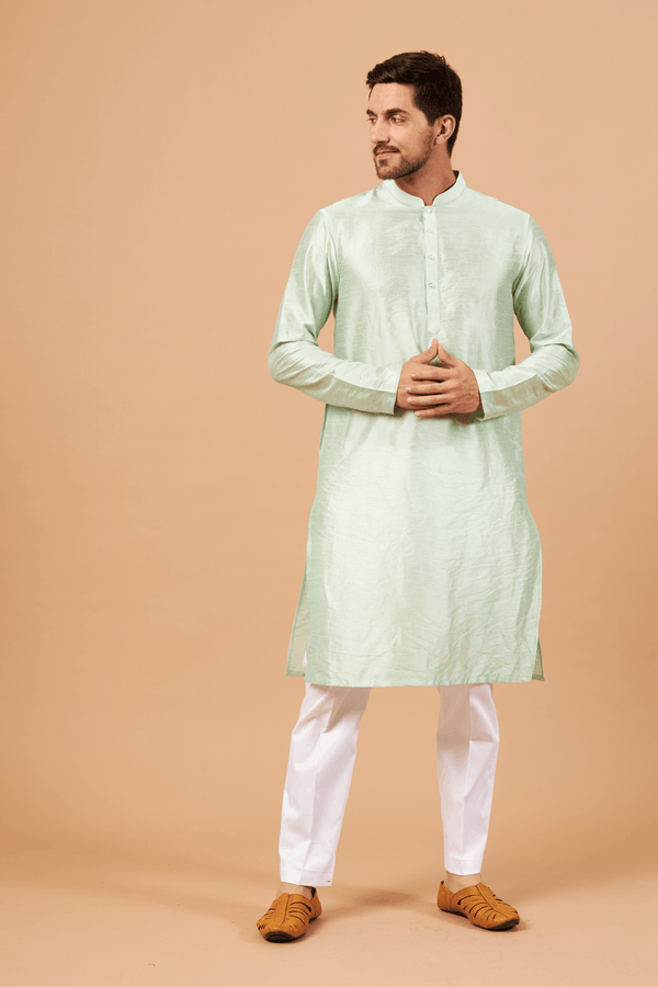 Pastel Green Designer Men's Kurta by Hilo DesignDescription: This pastel green kurta is made of falling raw silk, giving it a luxurious and soft fe...