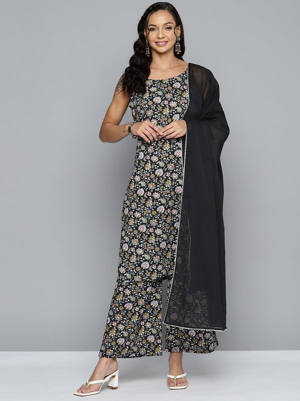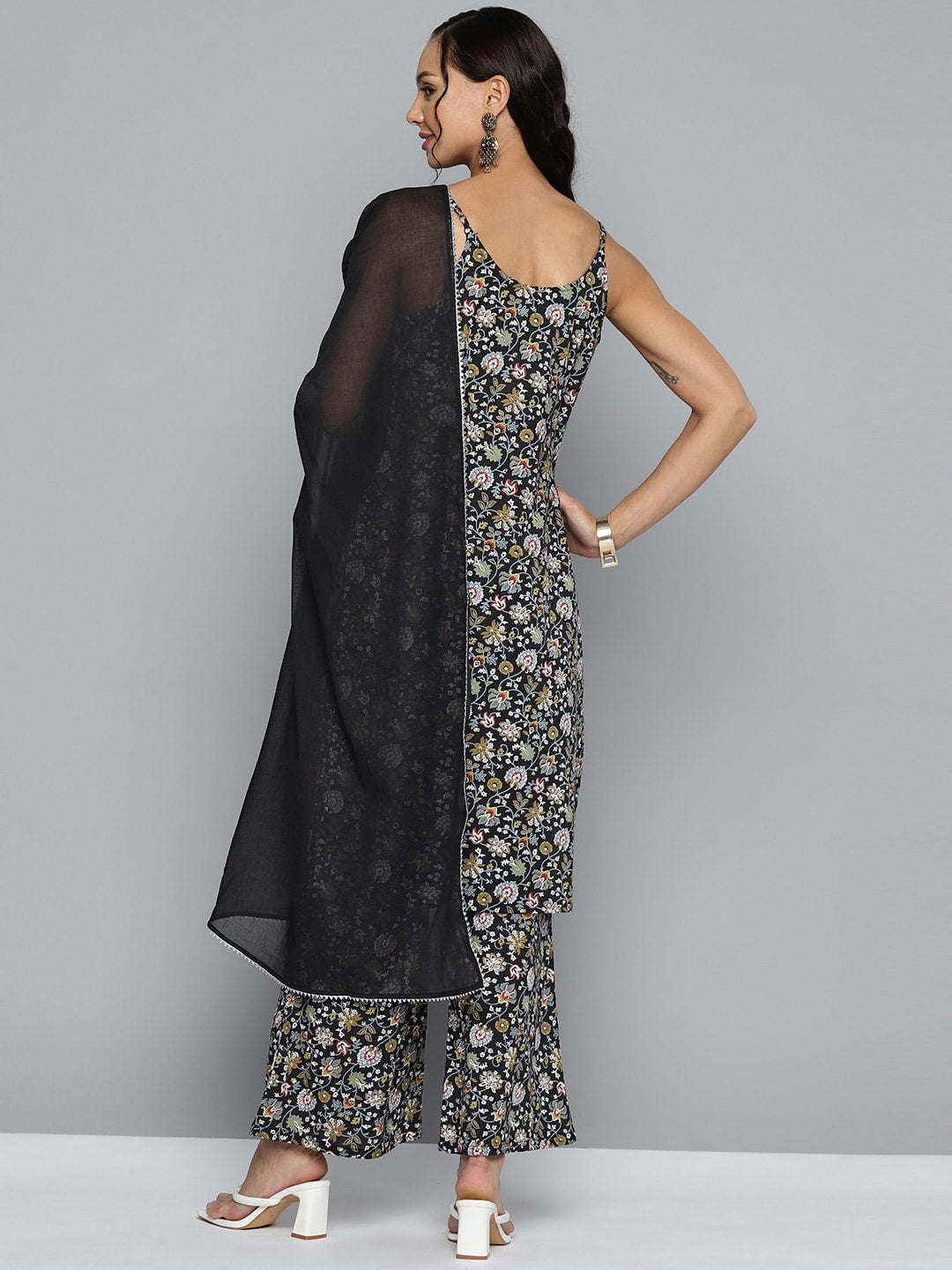 HERE&NOW Women Floral Printed Regular Pure Cotton Kurta with Palazzos & Dupatta Product Details Black printed Kurta with Palazzos with d...