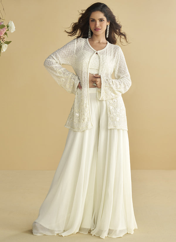 Vegaa Fashion White Georgette Embroidered Designer Palazzo With Jacket