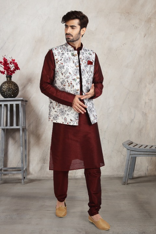 Raivat Ethnic Art Banarasi Silk Printed Work 3 Pics Jacket Set In Off White Colour