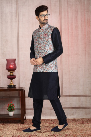 Raivat Ethnic Art Banarasi Silk Printed Work 3 Pics Jacket Set In Blue Colour