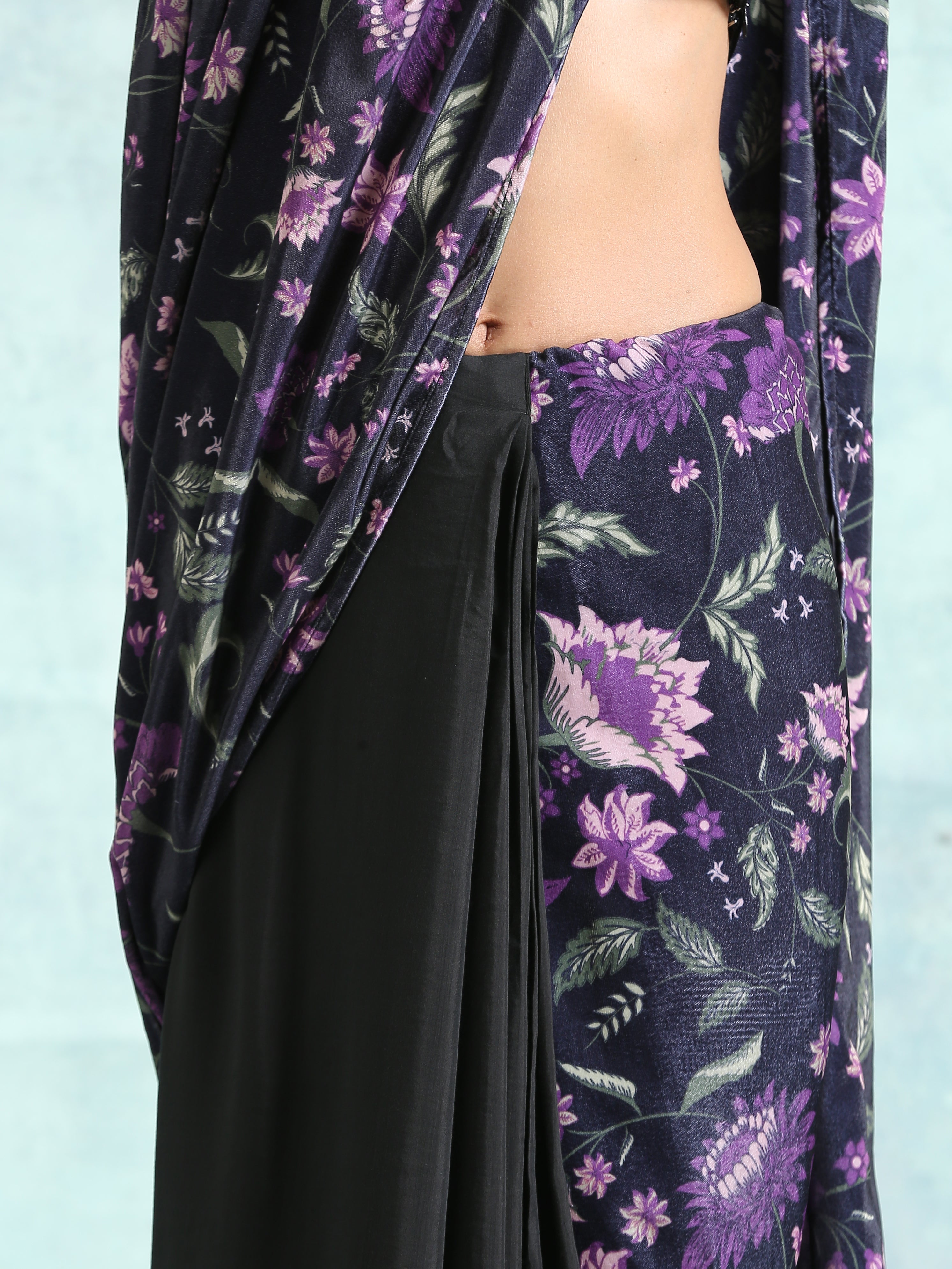 trueBrowns Black Printed Velvet Ready to Wear Saree - Freesize