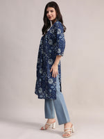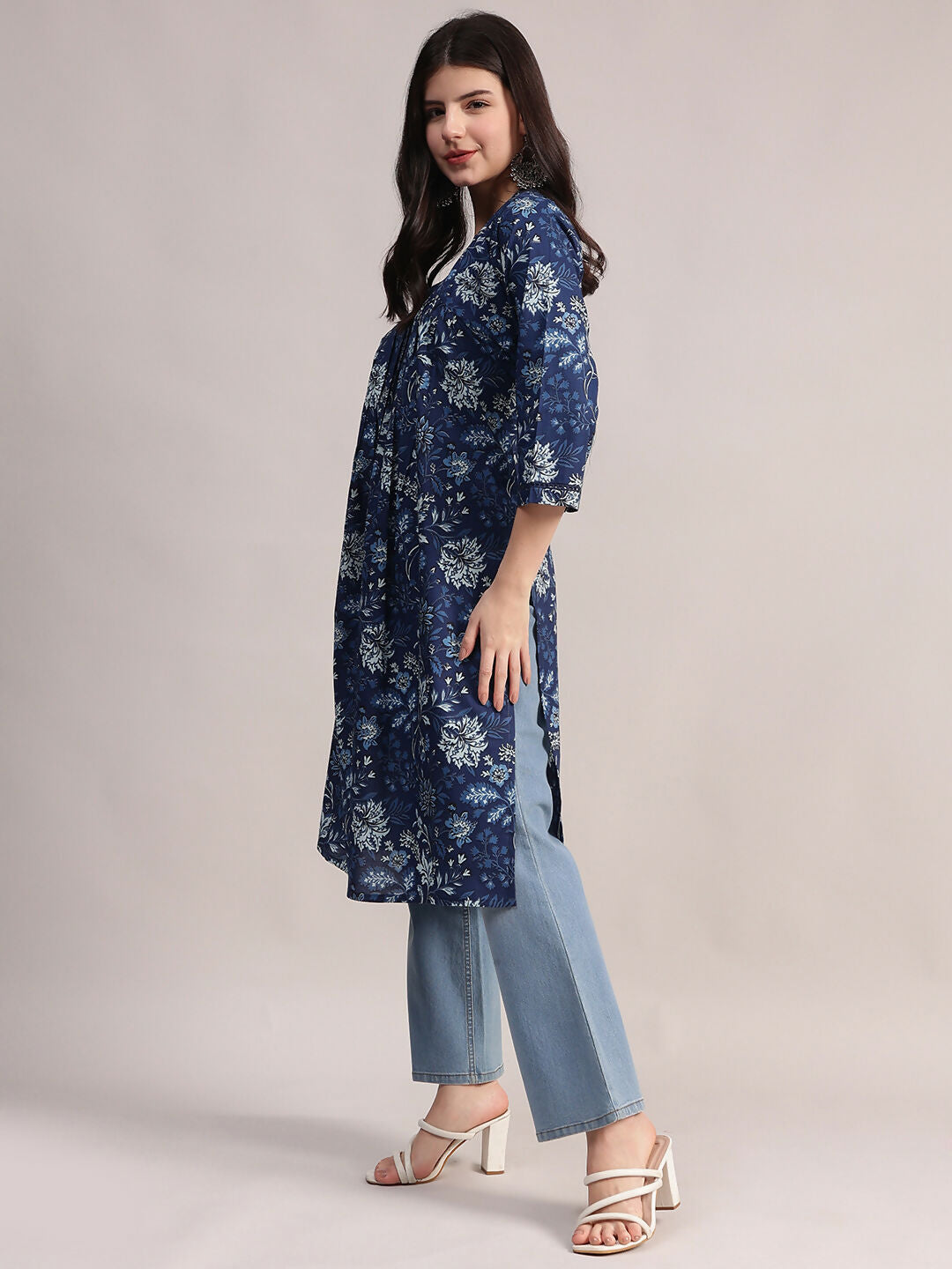 Aavyora Women's Navy Blue Floral Printed Cotton A-Line Kurta with Pintuck Detailing