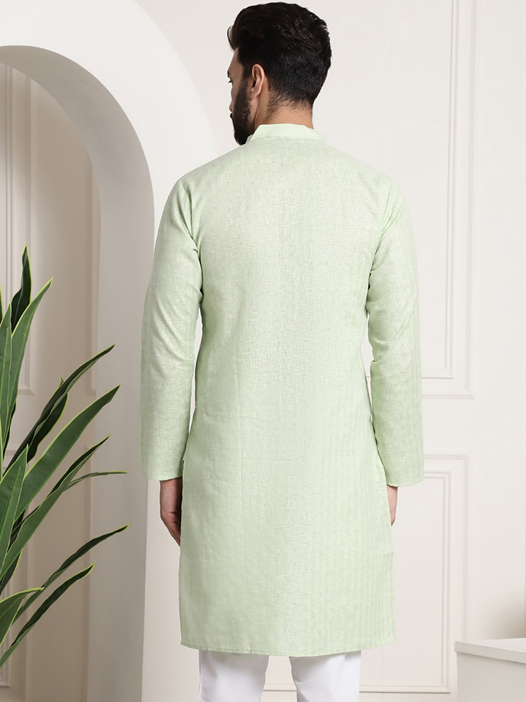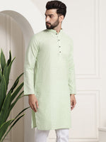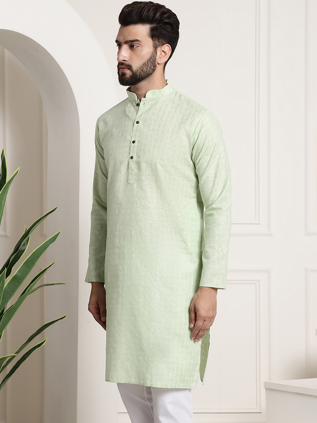 The green dobby checked straight kurta, has a mandarin collar, button closures, long sleeves, straight hem, two pockets, and side slits