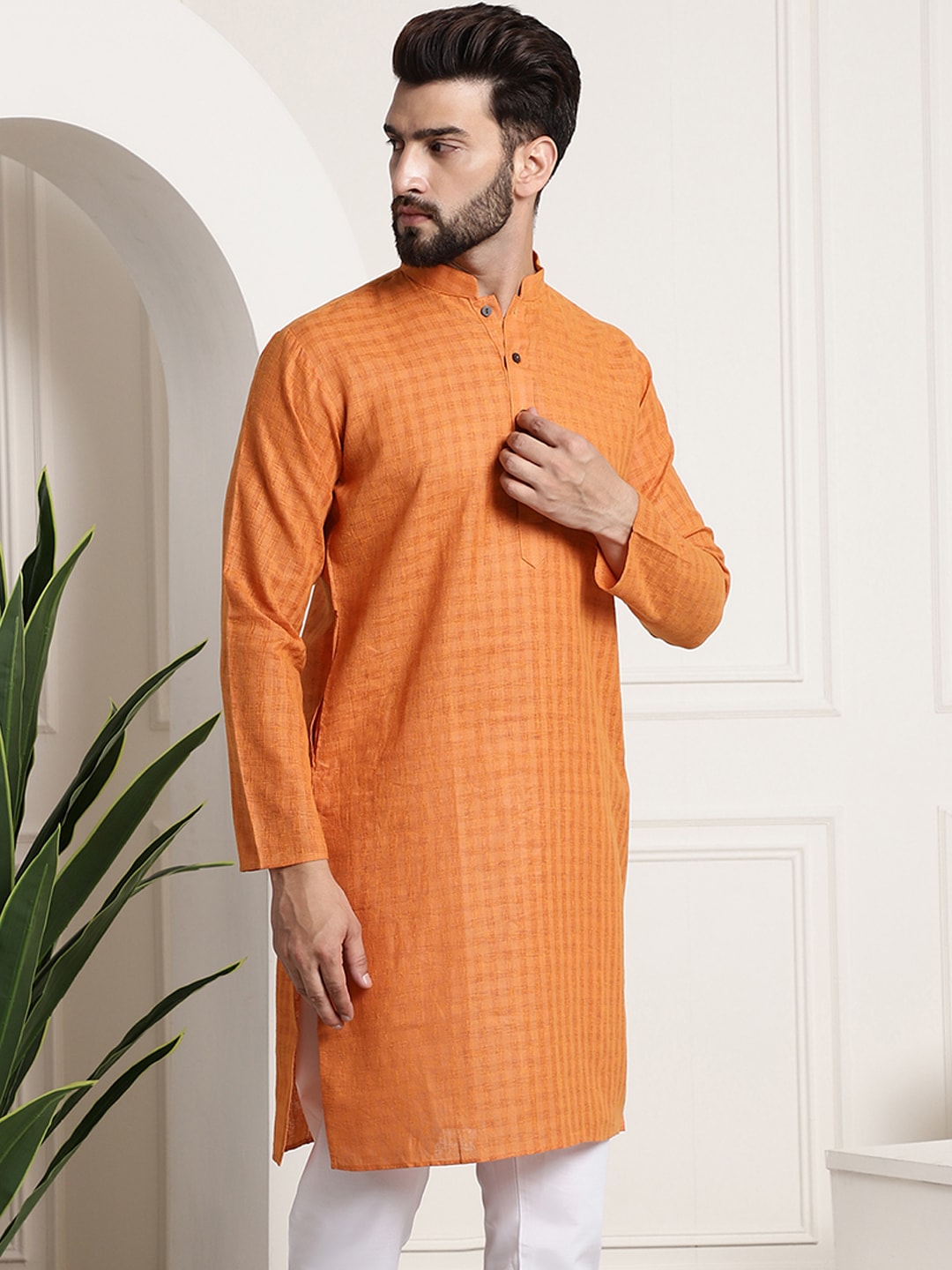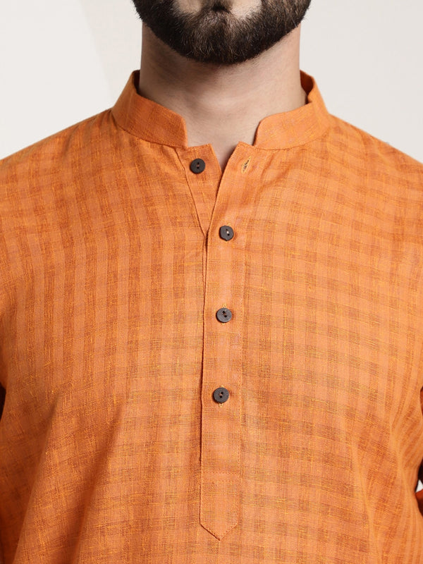 The Orange self-checked straight kurta, has a mandarin collar, long sleeves, straight hem, button closure, one pocket, and side slits