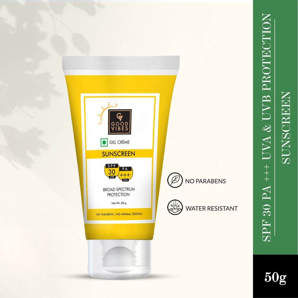 Good Vibes SPF 30 PA +++ UVA & UVB Protection Broad Spectrum Gel Creme Sunscreen is a highly-moisturizing, lightweight, and super hydrating formula that keeps your skin secured from all the harmful rays of the sun! It comes with an SPF 30, imparting a high degree of sun protection along with PA+++ that saves your skin from aging caused by the sun. Shielding you from both UVA & UVB rays while keeping your skin moisturized with a gel creme formula, Good Vibes SPF 30 PA +++ UVA & UVB Protection Broad Spectrum Gel Creme Sunscreen brings for you the best of all worlds!