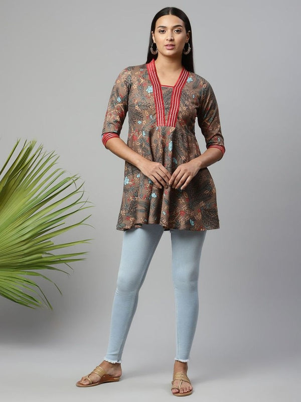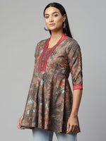 Brown-Coloured Cotton Digital Print Tunic, has a V Neck, Three-Quarter Sleeves, flared hem, Side Pocket. Taking the bright colours of summer and nature, Ahalyaa inspires the Women of style and substance to experiment with a range of colours from sophisticated black to subtle pastels and vibrant shades. So match the shade to your personality! Mix and match from a variety of colours and prints for a feminine look, or a modern twist.