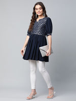Navy Blue-Coloured rayon printed tunic, has a keyhole neck, half sleeves, Hip Length, 1 side pocket. The detailing of this tunic is Silver foil print work. Taking the bright colours of summer and nature, Ahalyaa inspires the Women of style and substance to experiment with a range of colours and vibrant shades. So match the shade to your personality! Mix and match from a variety of colours and prints for a feminine look, or a modern twist.