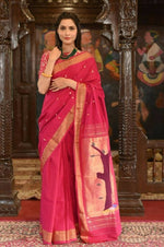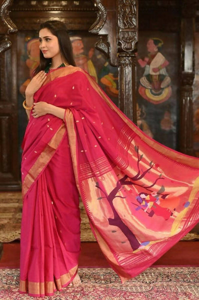 Very Much Indian Handloom Pure Cotton Paithani Radha Krishna Pallu-Red DelightProduct Description: Handloom Pure Cotton Paithanis are classy and su...