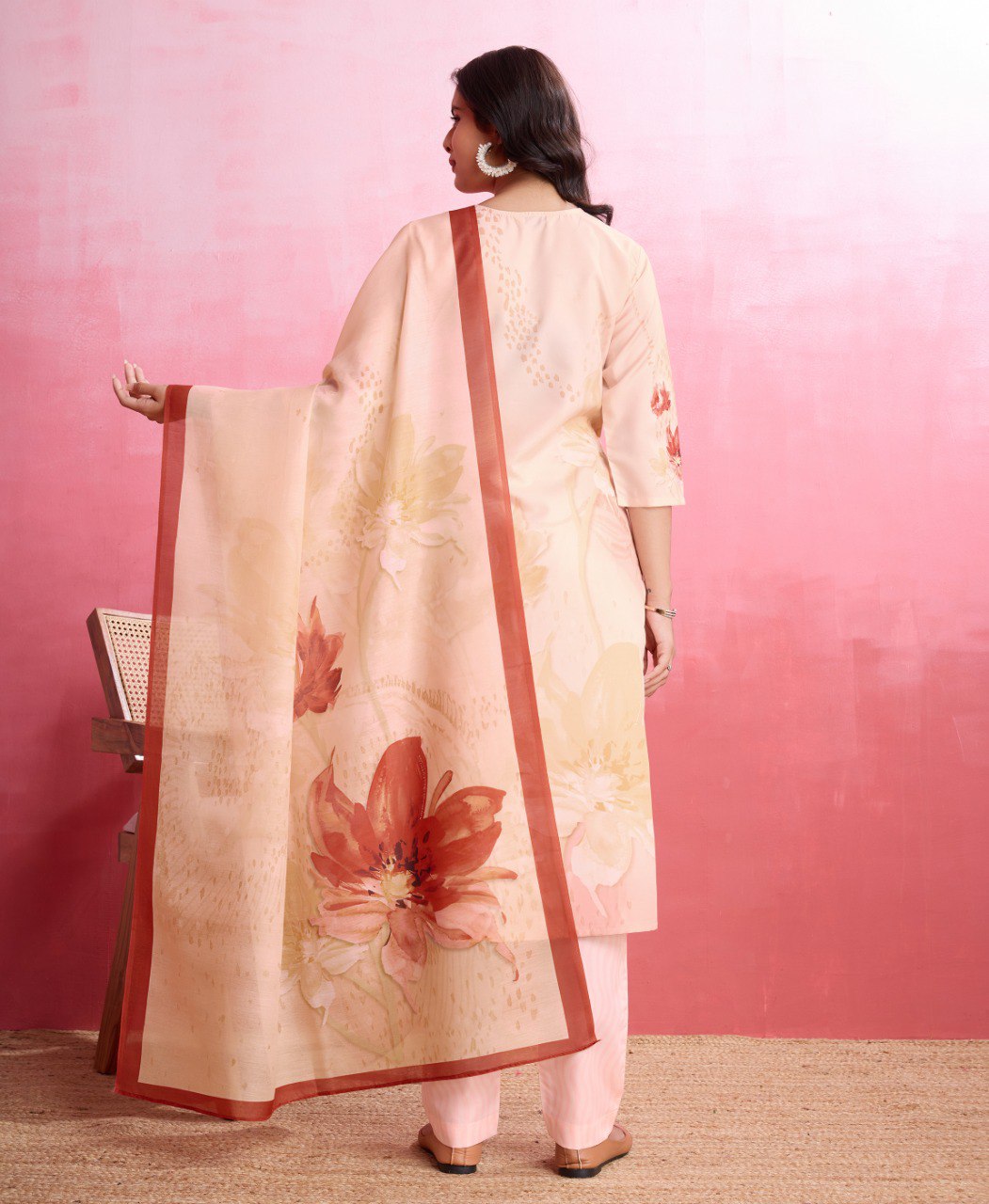 Prazu Fashion Peach Crepe Printed Designer Kurta SetAbout the Product: GENDER : Female Colour : Light Peach Work/Pattern : Printed Fabric : Crepe N...