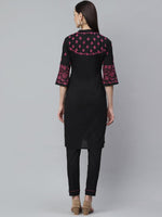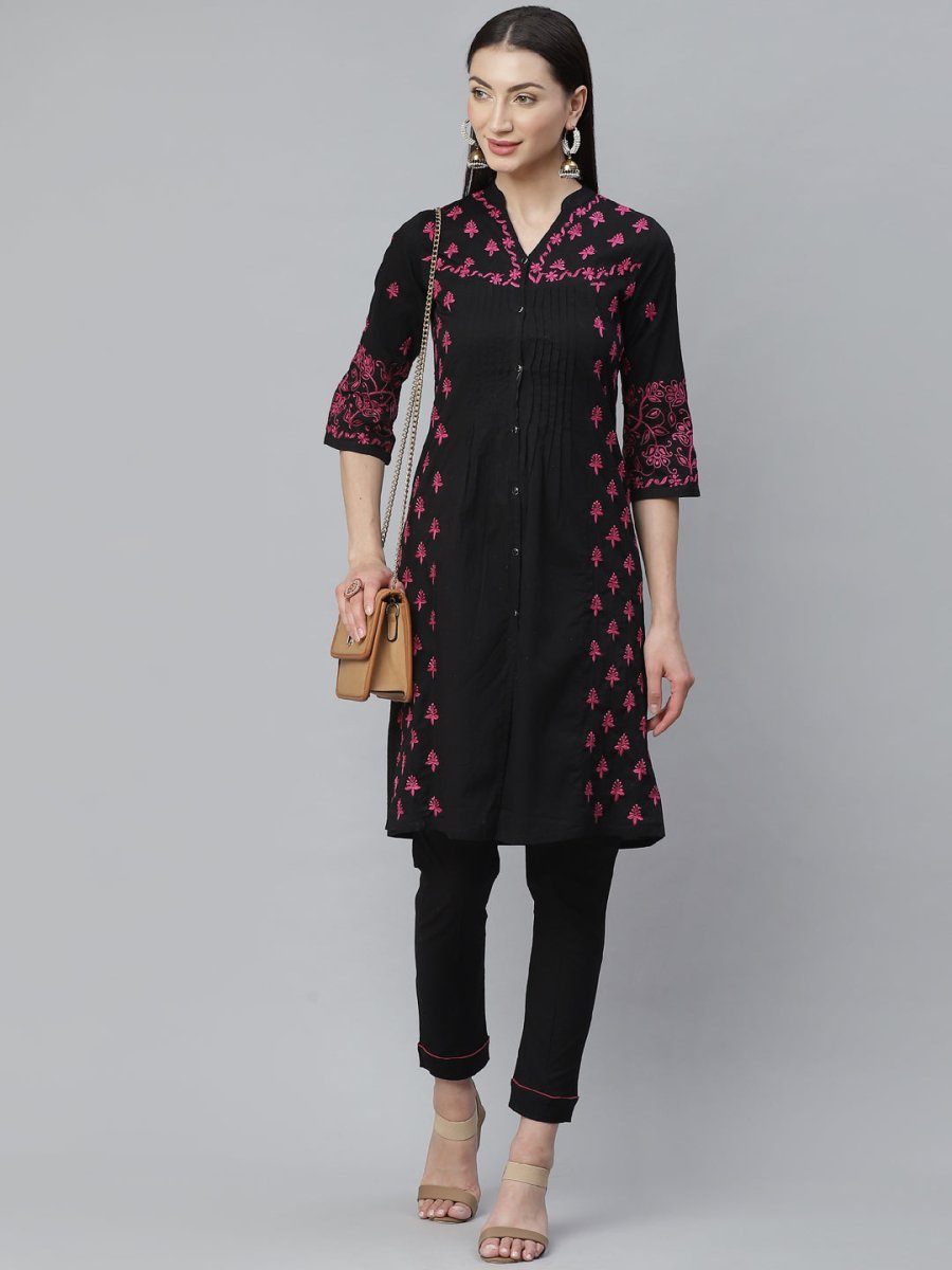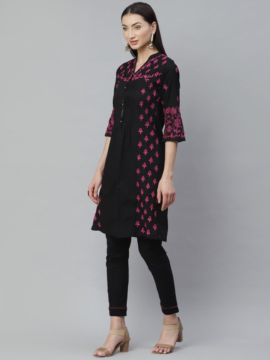 Black and pink Chikankari Hand Embroidered A-Line knee length kurta, has a mandarian collar , three-quarter sleeves,? button closure, straight hem, side slits