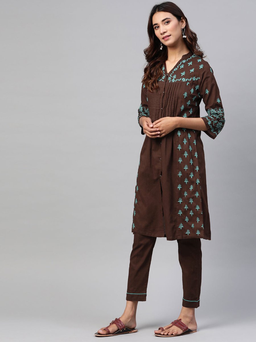 ADA Women Brown & Green Chikankari Embroidered Handloom Kurta with Trousers Product Details Brown and green chikankari embroidered kurta wit...