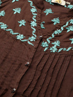 Brown and green chikankari embroidered midi length A-line kurta, has a mandarin collar, three-quarter sleeves, snap button closure, flared hem, front slit