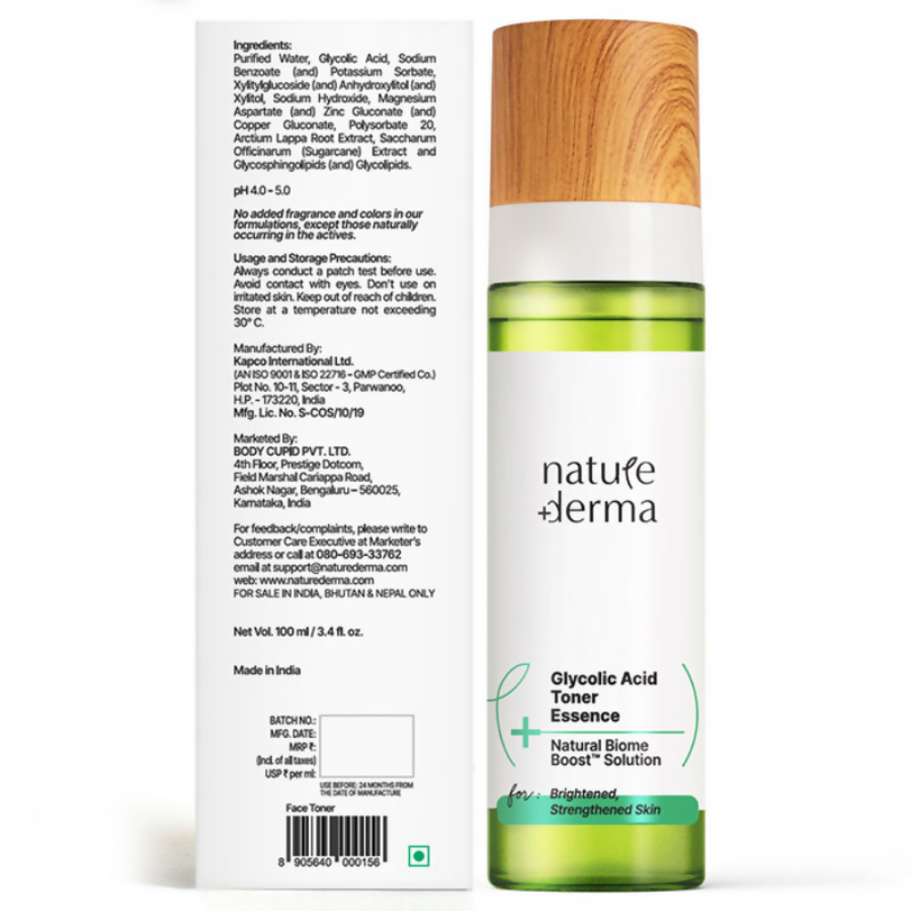 Nature Derma Glycolic Acid Toner Essence is an exfoliating toner that helps deliver glowing, smooth, even-toned skin. Containing glycolic acid, this toner helps to slough off dead skin cells to reveal radiant, brighter skin underneath. The toner is enriched with sugarcane extract, which works as a humectant and helps to keep the skin hydrated for a longer period. The AHA (glycolic acid) also helps to reduce dark spots, acne scars, and pigmentation.