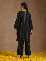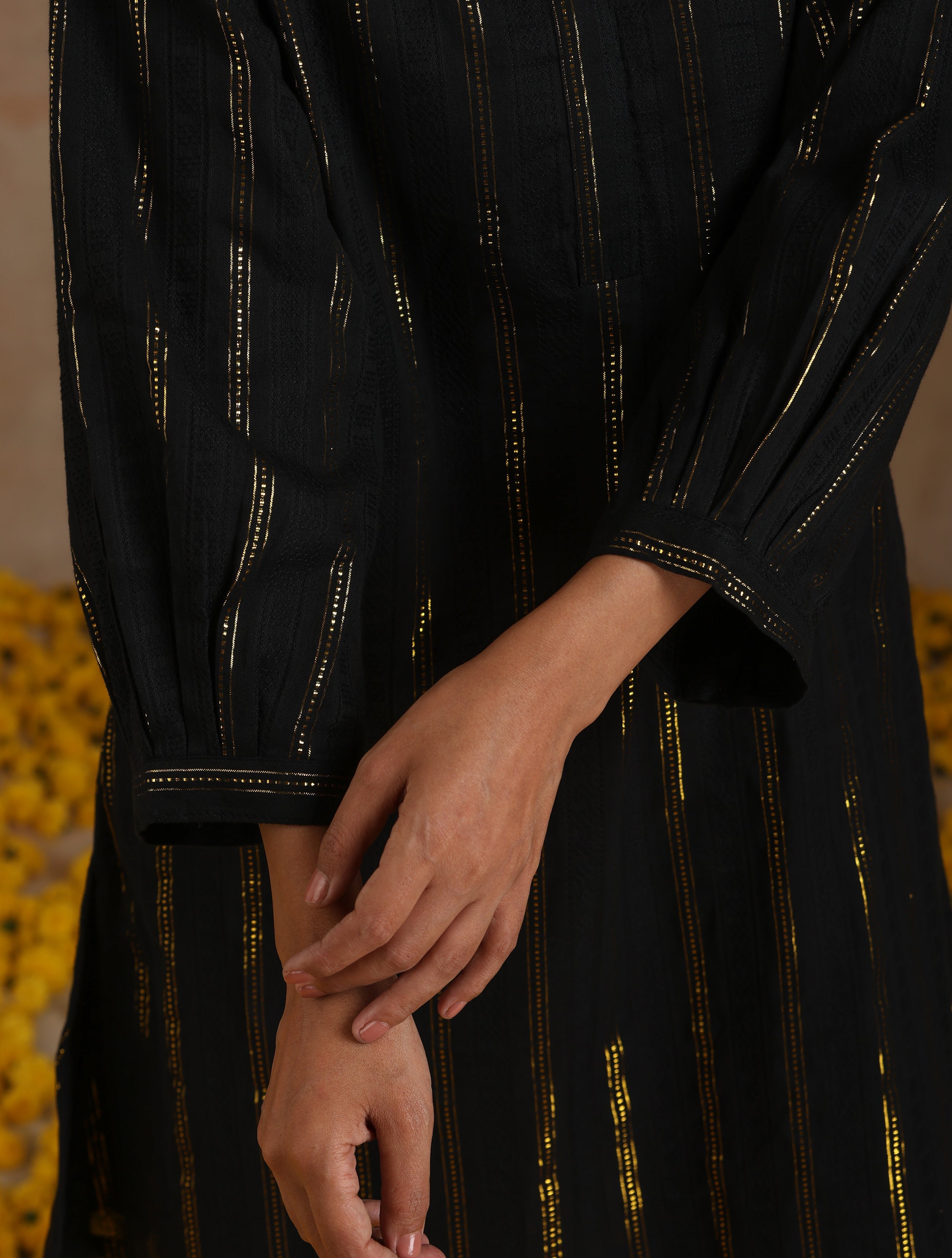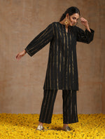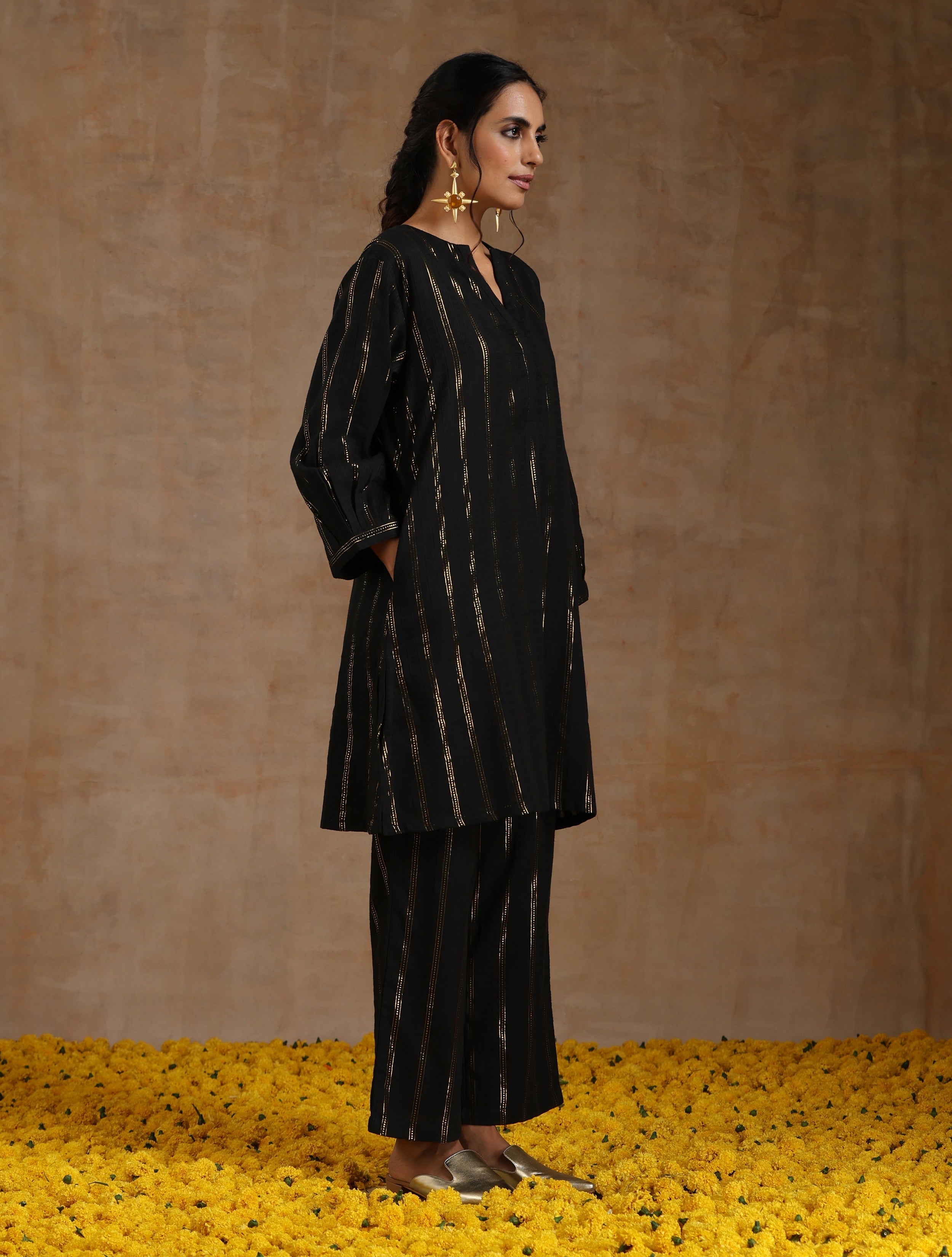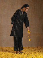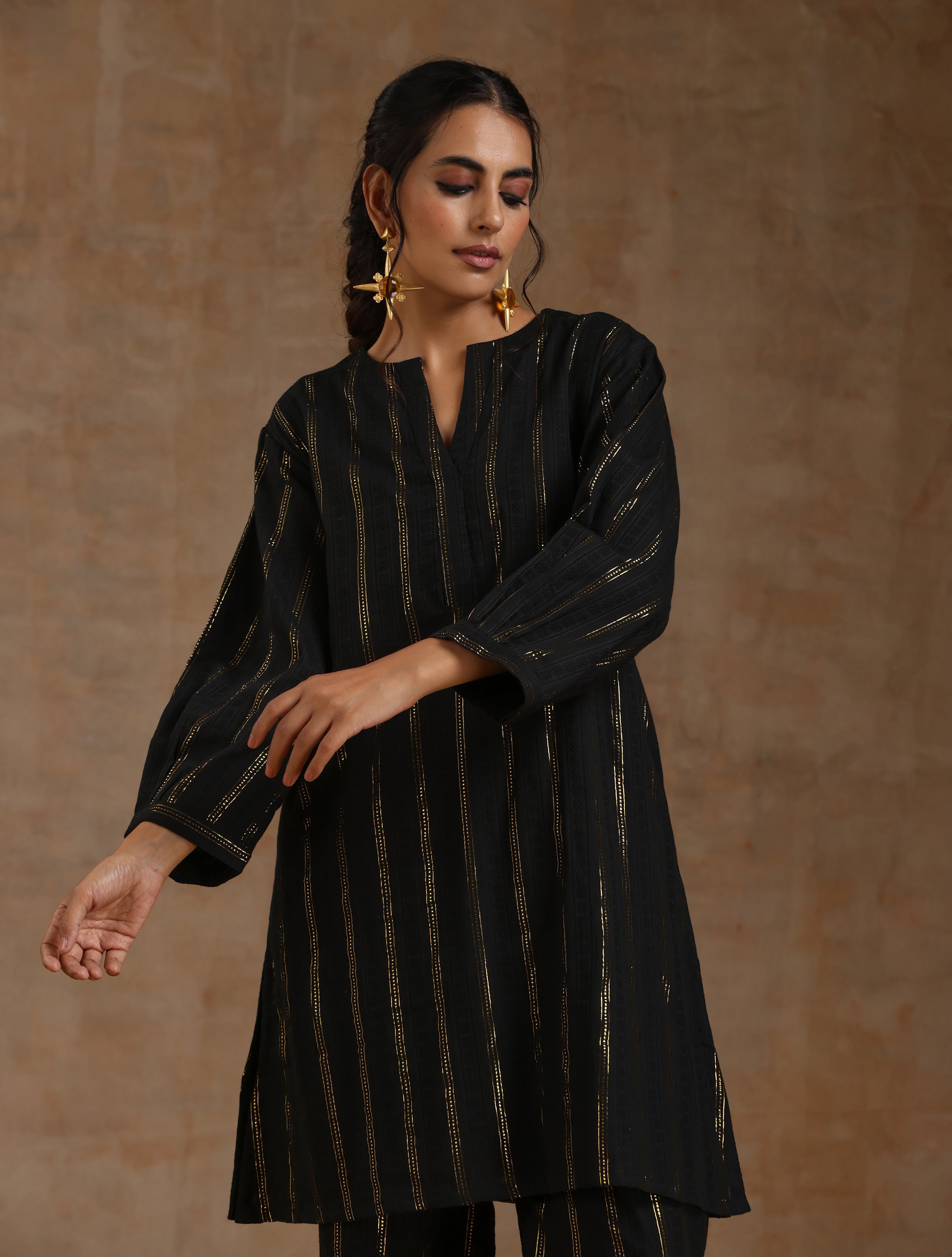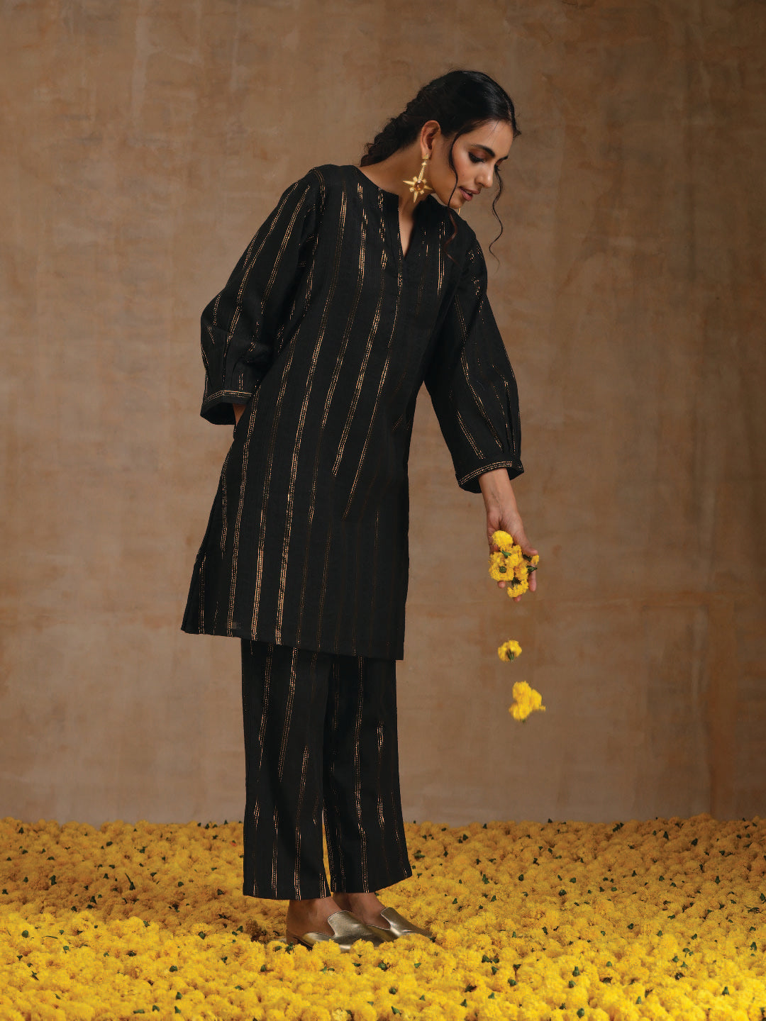 trueBrowns Black Gold Cotton Relaxed Co-Ord SetDescription  Cotton Lurex co-ord set with relaxed fit and pleated three- fourth sleeves. It has side...