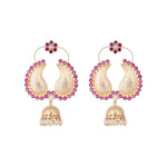 22k gold-plated small floral kundan studs with hoop holding paisley motifs enhanced with pink stones and pearls. Mini jhumka drop with pearls elegantly falls beneath, adding touch of grace. Anti-tarnish and hypoallergenic for lasting shine and comfort.
