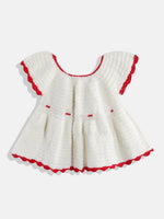 Chutput Kids Woollen Hand Knitted Full Sleeves Rosette Work Dress For Baby Girls - White - 0-3 M