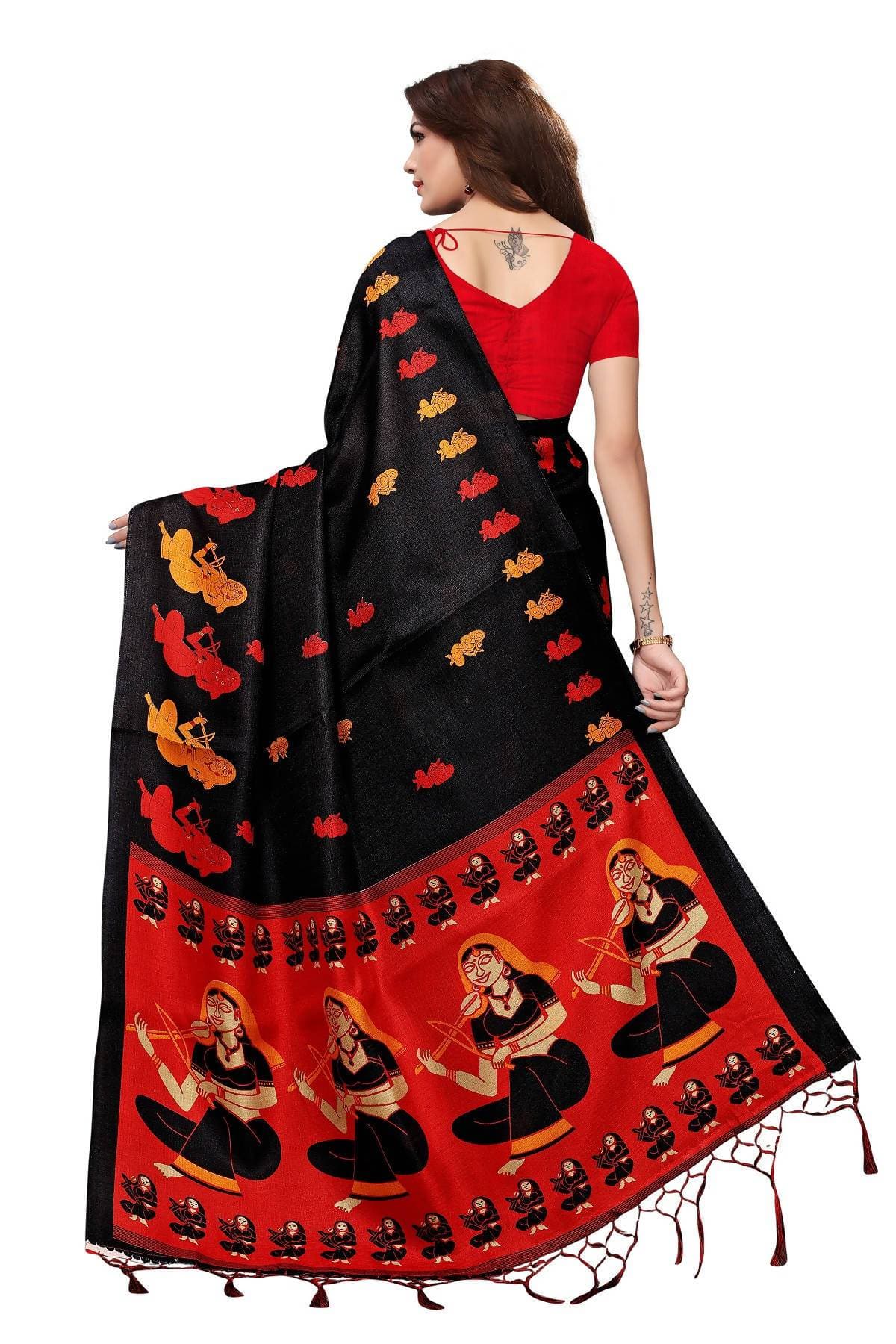 Vamika Black & Red Kalamkari With Jhalar Khadi Silk SareeWork: Kalamkari Print With JhalarPattern: Kalamkari With JhalarPackage Contents: Saree...