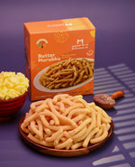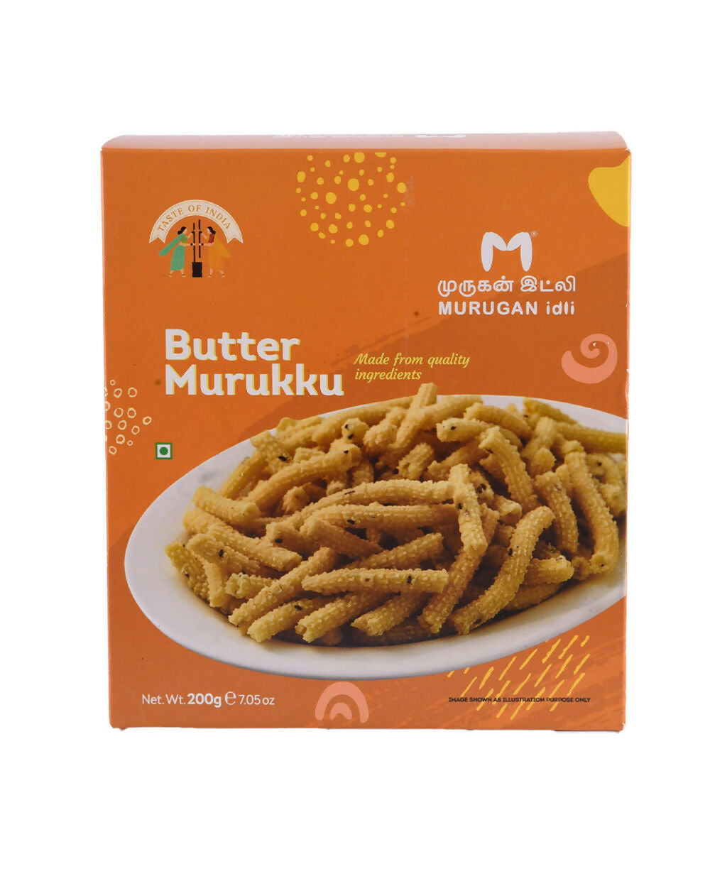 Murugan Idli Butter Murukku is a traditional Indian savory snack made using butter and other ingredients. This snack features a spiral shape and a crisp texture, offering a classic taste often enjoyed with tea or as a light snack.
