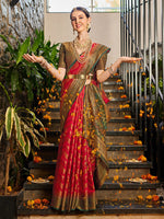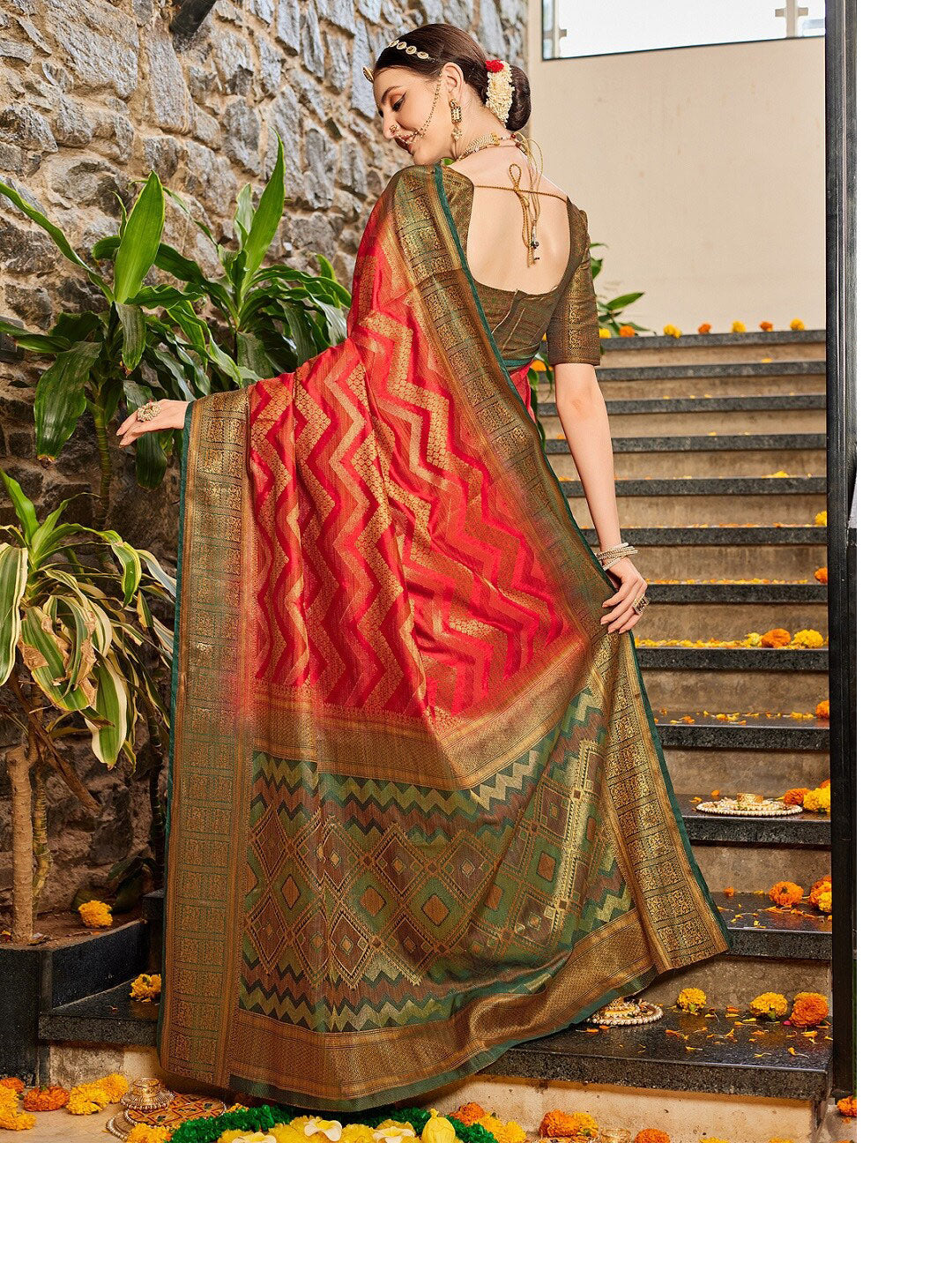 Kalini Ethnic Motifs Woven Design Zari Detail Kanjeevaram Saree Product Details Design Details Red and copper-toned kanjeevaram saree Ethnic m...