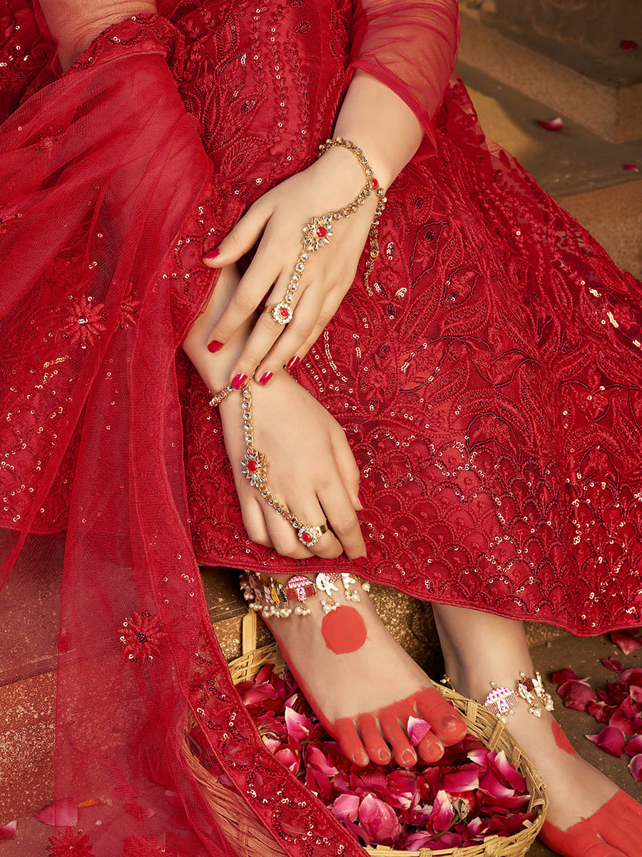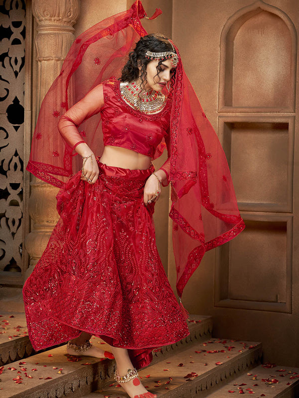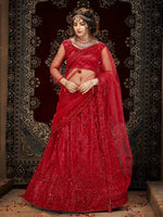 Myra Deep Red Heavy Embroidered Net Lehenga - Distacart