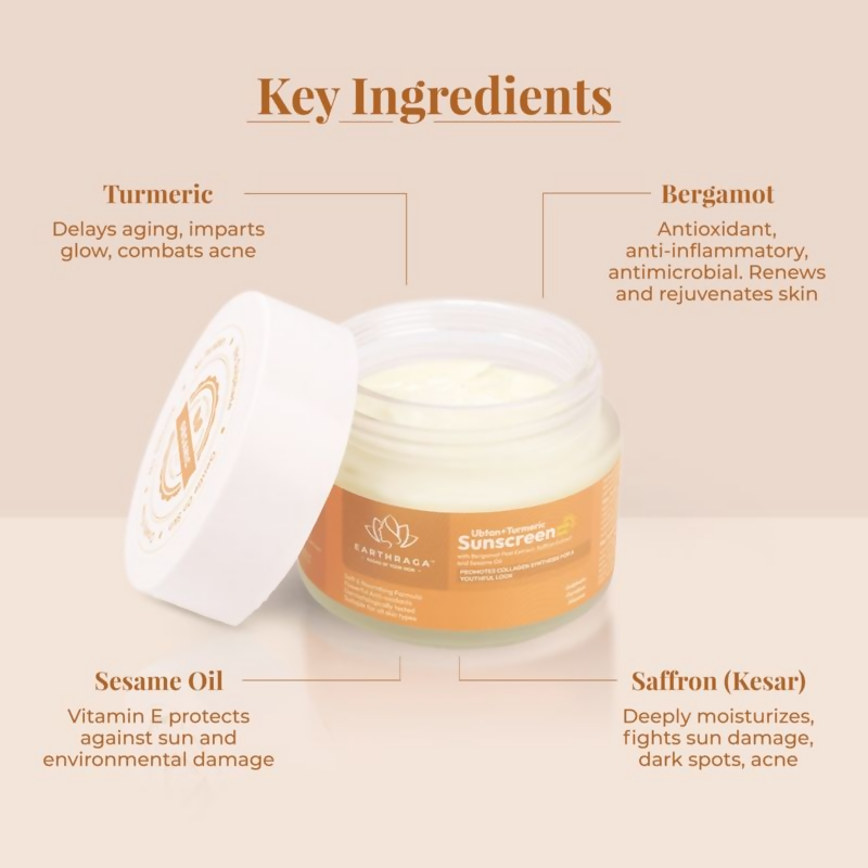 Introducing Earthraga Ubtan and Turmeric Sunscreen SPF50 Matte a gentle and nourishing sunscreen formulated with pure organic ingredients providing comprehensive protection against sun damage for your skin. Enriched with time-tested super ingredients such as Saffron Kesar Turmeric Haldi Sesame Oil and more this sunscreen not only shields your skin from harmful UV rays but also offers allaround skin nourishment and hydration resulting in supple youthful and radiant skin.